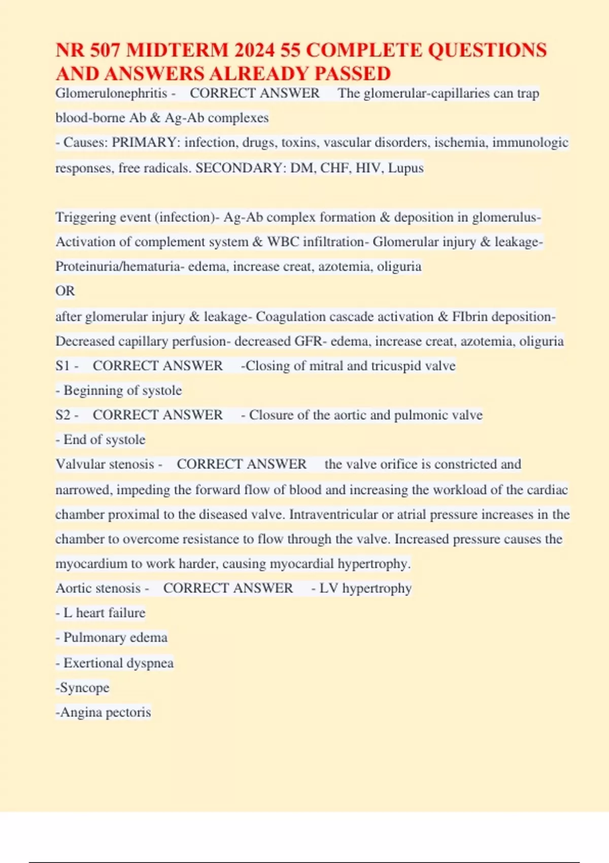 Glomerulonephritis - CORRECT ANSWER The glomerular-capillaries can trap blood-borne Ab & Ag-Ab complexes - Causes: PRIMARY: infection, drugs, toxins, vascular disorders, ischemia, immunologic responses, free radicals. SECONDARY: DM, CHF, HIV, Lupus Triggering event (infection)- Ag-Ab complex formation & deposition in glomerulus- Activation of complement system & WBC infiltration- Glomerular injury & leakage- Proteinuria/hematuria- edema, increase creat, azotemia, oliguria OR after glomerular injury & leakage- Coagulation cascade activation & FIbrin deposition- Decreased capillary perfusion- decreased GFR- edema, increase creat, azotemia, oliguria S1 - CORRECT ANSWER -Closing of mitral and tricuspid valve - Beginning of systole S2 - CORRECT ANSWER - Closure of the aortic and pulmonic valve - End of systole Valvular stenosis - CORRECT ANSWER the valve orifice is constricted and narrowed, impeding the forward flow of blood and increasing the workload of the cardiac chamber proximal to the diseased valve. Intraventricular or atrial pressure increases in the chamber to overcome resistance to flow through the valve. Increased pressure causes the myocardium to work harder, causing myocardial hypertrophy. Aortic stenosis - CORRECT ANSWER - LV hypertrophy - L heart failure - Pulmonary edema - Exertional dyspnea -Syncope -Angina pectoris - Systolic murmur Mitral Stenosis - CORRECT ANSWER - LA hypertrophy -R ventricular failure - Pulmonary edema - Orthopnea - Respiratory infections - PH -Edema -Atypical chest pain - Diastolic murmur Stroke volume - CORRECT ANSWER The volume of blood ejected per bear during systole Cor Pulmonale - CORRECT ANSWER right ventricular hypertrophy and heart failure due to pulmonary hypertension Cardiac output - CORRECT ANSWER HR x SV -Normal= 5Lpm -Preload, afterload, contractility, heart rate Preload - CORRECT ANSWER The volume inside the ventricle at the end of diastole Determined by: - Amount of venous blood returning to the ventricle during diastole - The amount of blood in the ventricle after systole Afterload - CORRECT ANSWER The resistance to ejection of blood from the ventricle total peripheral resistance (TPR) Systemic vascular resistance (SVR) Contractility - CORRECT ANSWER sympathetic nervous system, epi and norepi) + inotropes Acetylcholine released from vagus nerve - inotrope Cytokines released during sepsis impair contractility O2 < 50% decreased contractility Troponin - CORRECT ANSWER Relaxing protein Troponin T- aids in binding the troponin complex to actin and tropomyosin Troponin I- Inhibits the ATPhase of actomyosin Troponin C- Binding sites for the calcium ions involved in contraction. I & T and released into the blood during myocardial injury calcium binding and troponin - CORRECT ANSWER In resting muscle the myosin-binding sites are covered by troponin and tropomyosin. The calcium ions released into the sarcoplasm as a result of the action potential bind to the troponin. This binding causes the tropomyosin and troponin to move out of the way of the myosin-binding sites, leaving the myosin heads free to bind to the actin microfilament. Macrophages - CORRECT ANSWER -Phagocytic cells