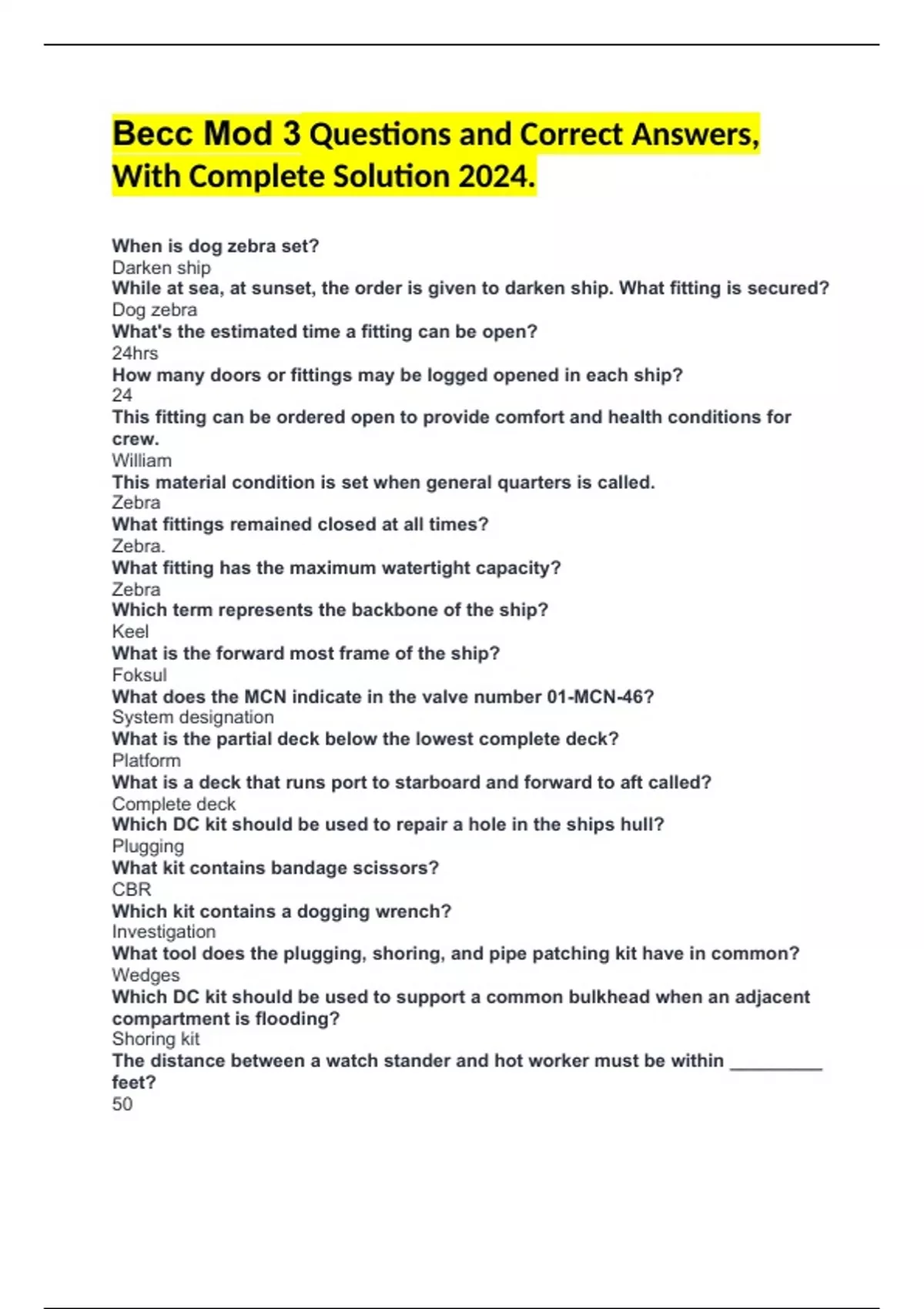 Becc Mod 3 Questions and Correct Answers, With Complete Solution 2024. When is dog zebra set? Darken ship While at sea, at sunset, the order is given to darken ship. What fitting is secured? Dog zebra What's the estimated time a fitting can be open? 24hrs How many doors or fittings may be logged opened in each ship? 24 This fitting can be ordered open to provide comfort and health conditions for crew. William This material condition is set when general quarters is called. Zebra What fittings remained closed at all times? Zebra. What fitting has the maximum watertight capacity? Zebra Which term represents the backbone of the ship? Keel What is the forward most frame of the ship? Foksul What does the MCN indicate in the valve number 01-MCN-46? System designation What is the partial deck below the lowest complete deck? Platform What is a deck that runs port to starboard and forward to aft called? Complete deck Which DC kit should be used to repair a hole in the ships hull? Plugging What kit contains bandage scissors? CBR Which kit contains a dogging wrench? Investigation What tool does the plugging, shoring, and pipe patching kit have in common? Wedges Which DC kit should be used to support a common bulkhead when an adjacent compartment is flooding? Shoring kit The distance between a watch stander and hot worker must be within _________ feet? 50