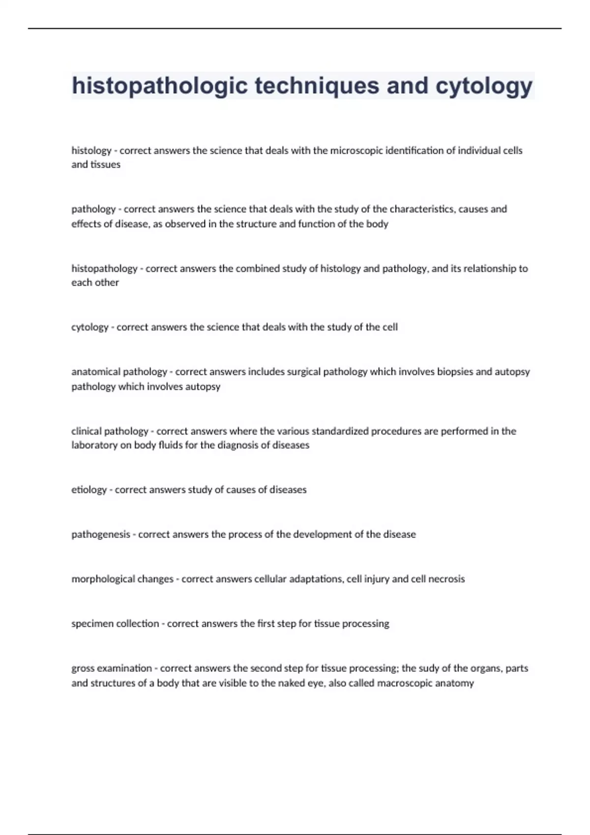 histopathologic techniques and cytologyhistology - correct answers the science that deals with the microscopic identification of individual cells and tissues pathology - correct answers the science that deals with the study of the characteristics, causes and effects of disease, as observed in the structure and function of the body histopathology - correct answers the combined study of histology and pathology, and its relationship to each other cytology - correct answers the science that deals with the study of the cell anatomical pathology - correct answers includes surgical pathology which involves biopsies and autopsy pathology which involves autopsy clinical pathology - correct answers where the various standardized procedures are performed in the laboratory on body fluids for the diagnosis of diseases etiology - correct answers study of causes of diseases pathogenesis - correct answers the process of the development of the disease morphological changes - correct answers cellular adaptations, cell injury and cell necrosis specimen collection - correct answers the first step for tissue processing gross examination - correct answers the second step for tissue processing; the sudy of the organs, parts and structures of a body that are visible to the naked eye, also called macroscopic anatomy