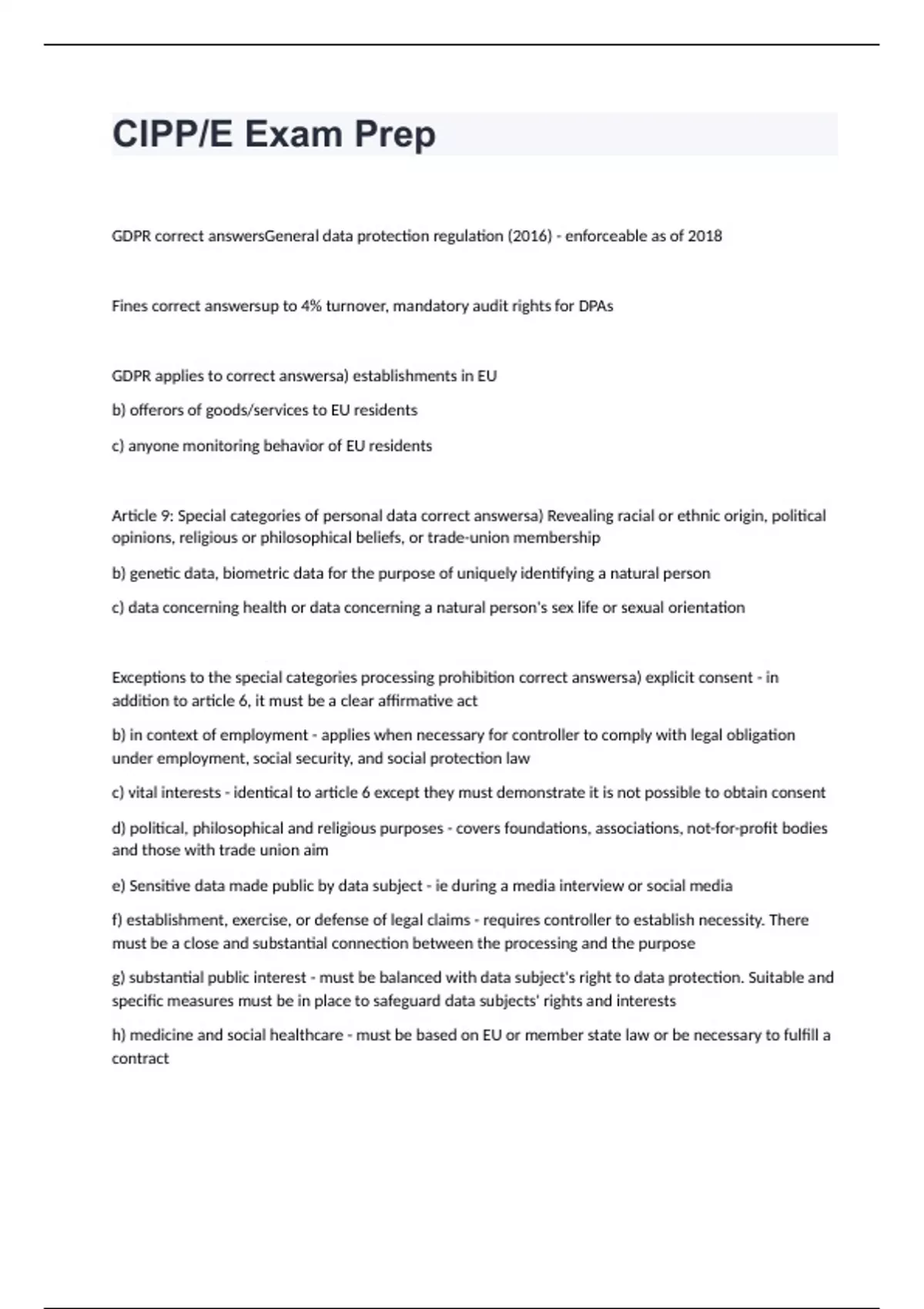 GDPR correct answersGeneral data protection regulation (2016) - enforceable as of 2018 Fines correct answersup to 4% turnover, mandatory audit rights for DPAs GDPR applies to correct answersa) establishments in EU b) offerors of goods/services to EU residents c) anyone monitoring behavior of EU residents Article 9: Special categories of personal data correct answersa) Revealing racial or ethnic origin, political opinions, religious or philosophical beliefs, or trade-union membership b) genetic data, biometric data for the purpose of uniquely identifying a natural person c) data concerning health or data concerning a natural person's sex life or sexual orientation Exceptions to the special categories processing prohibition correct answersa) explicit consent - in addition to article 6, it must be a clear affirmative act b) in context of employment - applies when necessary for controller to comply with legal obligation under employment, social security, and social protection law c) vital interests - identical to article 6 except they must demonstrate it is not possible to obtain consent d) political, philosophical and religious purposes - covers foundations, associations, not-for-profit bodies and those with trade union aim e) Sensitive data made public by data subject - ie during a media interview or social media f) establishment, exercise, or defense of legal claims - requires controller to establish necessity. There must be a close and substantial connection between the processing and the purpose g) substantial public interest - must be balanced with data subject's right to data protection. Suitable and specific measures must be in place to safeguard data subjects' rights and interests h) medicine and social healthcare - must be based on EU or member state law or be necessary to fulfill a contract