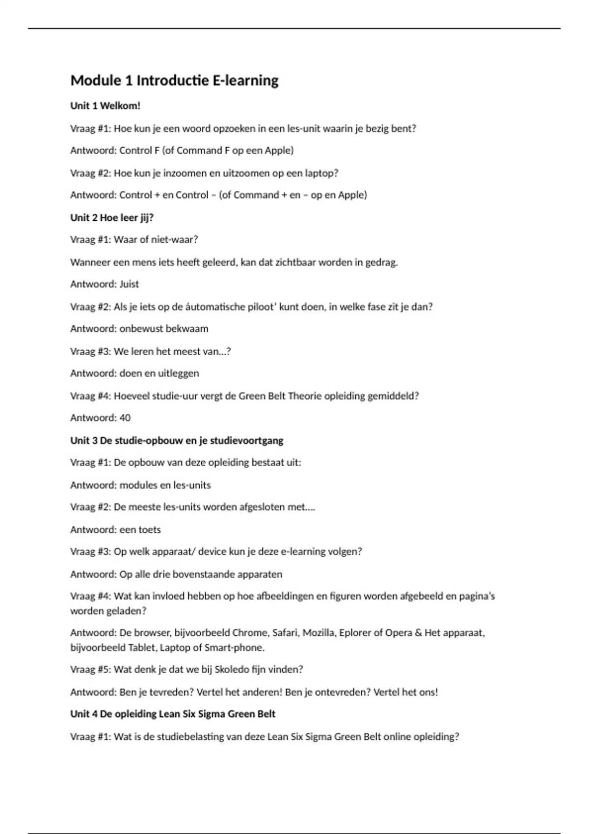 De antwoorden van module 1 van de online lean six sigma green belt theorie.