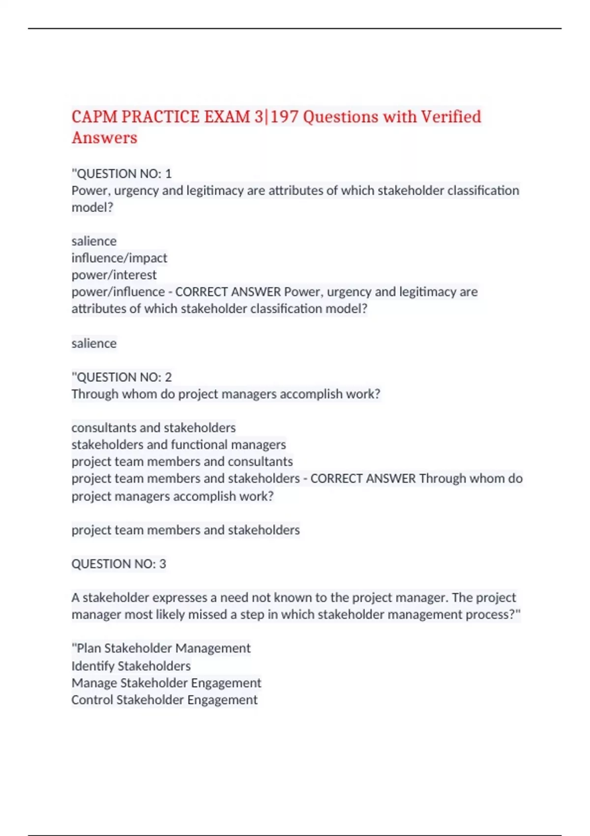 CAPM PRACTICE EXAM 3|197 Questions with Verified Answers "QUESTION NO: 1 Power, urgency and legitimacy are attributes of which stakeholder classification model? salience influence/impact power/interest power/influence - CORRECT ANSWER Power, urgency and legitimacy are attributes of which stakeholder classification model? salience "QUESTION NO: 2 Through whom do project managers accomplish work? consultants and stakeholders stakeholders and functional managers project team members and consultants project team members and stakeholders - CORRECT ANSWER Through whom do project managers accomplish work? project team members and stakeholders QUESTION NO: 3 A stakeholder expresses a need not known to the project manager. The project manager most likely missed a step in which stakeholder management process?" "Plan Stakeholder Management Identify Stakeholders Manage Stakeholder Engagement Control Stakeholder Engagement " - CORRECT ANSWER A stakeholder expresses a need not known to the project manager. The project manager most likely missed a step in which stakeholder management process?" "Plan Stakeholder Management QUESTION NO: 4 Skills necessary for project management such as motivating to provide encouragement; listening actively; persuading a team to perform an action; and summarizing, recapping and identifying next steps are known as: organizational skills. technical skills. communication skills. hard skills. - CORRECT ANSWER Skills necessary for project management such as motivating to provide encouragement; listening actively; persuading a team to perform an action; and summarizing, recapping and identifying next steps are known as: communication skills. QUESTION NO: 5 When a project is undertaken to reduce defects in a product or service, the objective of the project is to create a/an: improvement. program. result. portfolio. - CORRECT ANSWER When a project is undertaken to reduce defects in a product or service, the objective of the project is to create a/an: improvement. QUESTION NO: 6 The degree of uncertainty an entity is willing to take on in anticipation of a reward is known as its risk ___________. management. response. tolerance. appetite. - CORRECT ANSWER The degree of uncertainty an entity is willing to take on in anticipation of a reward is known as its risk ___________. appetite. "QUESTION NO: 7 The zero duration of milestones in project planning occurs because milestones: are unpredictable and challenge the Plan Schedule Management process. occur at random times in the project plans. represent a moment in time such as a significant project point or event. represent both significant and insignificant points in the project and are difficult to anticipate. - CORRECT ANSWER The zero duration of milestones in project planning occurs because milestones: represent a moment in time such as a significant project point or event. QUESTION NO: 8 The component of the human resource management plan that includes ways in which team members can obtain certifications that support their ability to benefit the project is known as: recognition and rewards. compliance. staff acquisition. training needs. - CORRECT ANSWER The component of the human resource management plan that includes ways in which team members can obtain certifications that support their ability to benefit the project is known as: training needs. QUESTION NO: 9 Stakeholders can be identified in later stages of the project because the Identify Stakeholders process should be: continuous. discrete. regulated. arbitrary. - CORRECT ANSWER Stakeholders can be identified in later stages of the project because the Identify Stakeholders process should be: continuous. QUESTION NO: 10 In project management, a temporary project can be: completed without planning. a routine business process. long in duration. ongoing to produce goods. - CORRECT ANSWER In project management, a temporary project can be: long in duration. QUESTION NO: 11 Which document in the project management plan can be updated in the Plan Procurement Management process? budget estimates risk matrix requirements documentation procurement documents - CORRECT ANSWER Which document in the project management plan can be updated in the Plan Procurement Management process? requirements documentation "QUESTION NO: 12 Which type of probability distribution is used to represent uncertain events such as the outcome of a test or a possible scenario in a decision tree? uniform continuous discrete linear" - CORRECT ANSWER Which type of probability distribution is used to represent uncertain events such as the outcome of a test or a possible scenario in a decision tree? discrete QUESTION NO: 14 Which process involves determining, documenting and managing stakeholders' needs and requirements to meet project objectives? Collect Requirements Plan Scope Management Define Scope Define Activities - CORRECT ANSWER Which process involves determining, documenting and managing stakeholders' needs and requirements to meet project objectives? Collect Requirements QUESTION NO: 15 Plan Communications Management develops an approach and plan for project communications based on stakeholders' needs and requirements and: available organizational assets. project staff assignments. interpersonal skills. enterprise environmental factors. - CORRECT ANSWER Plan Communications Management develops an approach and plan for project communications based on stakeholders' needs and requirements and: available organizational assets. QUESTION NO: 16 What is the risk rating if the probability of occurrence is 0.30 and the impact if it does occur is moderate (0.20)? 0.03 0.06 0.10 0.50 - CORRECT ANSWER What is the risk rating if the probability of occurrence is 0.30 and the impact if it does occur is moderate (0.20)? 0.06 QUESTION NO: 17 A complete set of concepts, terms and activities that comprise an area of specialization is known as: a Knowledge Area. a Process Group. program management. portfolio management. - CORREC