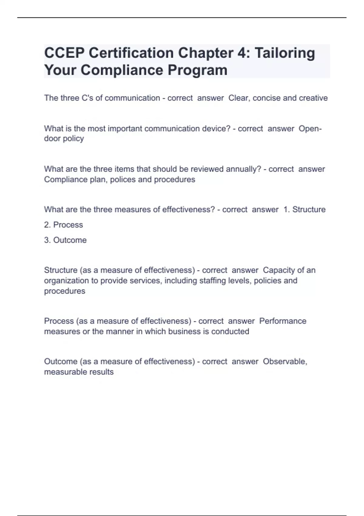 CCEP Certification Chapter 4 Question and answers 2024 verified to passThe three C's of communication - correct answer Clear, concise and creative What is the most important communication device? - correct answer Open-door policy What are the three items that should be reviewed annually? - correct answer Compliance plan, polices and procedures What are the three measures of effectiveness? - correct answer 1. Structure 2. Process 3. Outcome Structure (as a measure of effectiveness) - correct answer Capacity of an organization to provide services, including staffing levels, policies and procedures Process (as a measure of effectiveness) - correct answer Performance measures or the manner in which business is conducted Outcome (as a measure of effectiveness) - correct answer Observable, measurable results