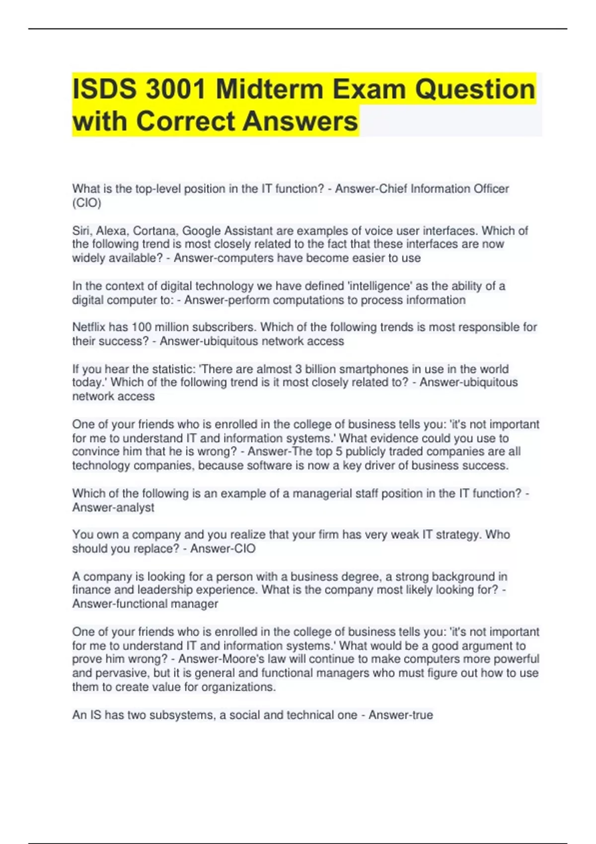 ISDS 3001 Midterm Exam Question with Correct Answers What is the top-level position in the IT function? - Answer-Chief Information Officer (CIO) Siri, Alexa, Cortana, Google Assistant are examples of voice user interfaces. Which of the following trend is most closely related to the fact that these interfaces are now widely available? - Answer-computers have become easier to use In the context of digital technology we have defined 'intelligence' as the ability of a digital computer to: - Answer-perform computations to process information Netflix has 100 million subscribers. Which of the following trends is most responsible for their success? - Answer-ubiquitous network access If you hear the statistic: 'There are almost 3 billion smartphones in use in the world today.' Which of the following trend is it most closely related to? - Answer-ubiquitous network access One of your friends who is enrolled in the college of business tells you: 'it's not important for me to understand IT and information systems.' What evidence could you use to convince him that he is wrong? - Answer-The top 5 publicly traded companies are all technology companies, because software is now a key driver of business success. Which of the following is an example of a managerial staff position in the IT function? - Answer-analyst You own a company and you realize that your firm has very weak IT strategy. Who should you replace? - Answer-CIO A company is looking for a person with a business degree, a strong background in finance and leadership experience. What is the company most likely looking for? - Answer-functional manager One of your friends who is enrolled in the college of business tells you: 'it's not important for me to understand IT and information systems.' What would be a good argument to prove him wrong? - Answer-Moore's law will continue to make computers more powerful and pervasive, but it is general and functional managers who must figure out how to use them to create value for organizations.