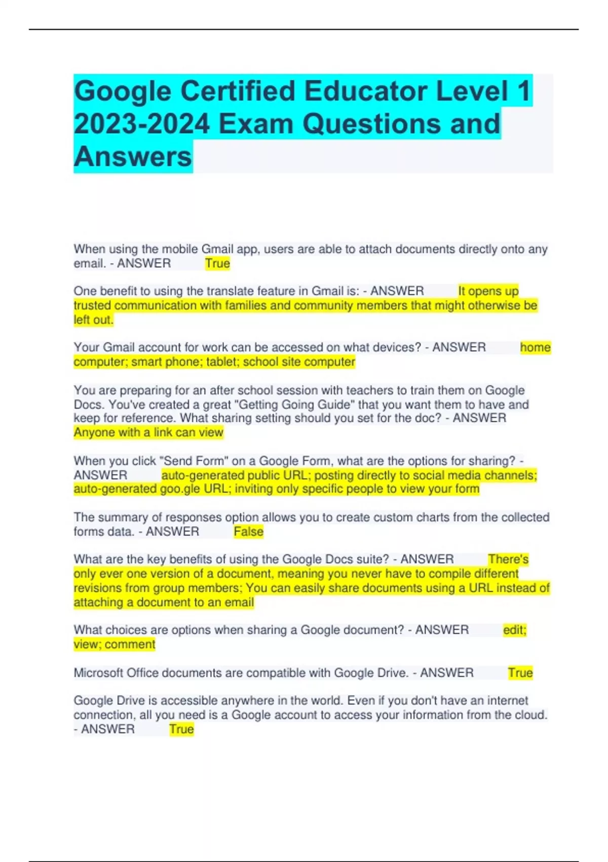 Google Certified Educator Level 1 Exam Questions and Answers When using the mobile Gmail app, users are able to attach documents directly onto any email. - ANSWER True One benefit to using the translate feature in Gmail is: - ANSWER It opens up trusted communication with families and community members that might otherwise be left out. Your Gmail account for work can be accessed on what devices? - ANSWER home computer; smart phone; tablet; school site computer You are preparing for an after school session with teachers to train them on Google Docs. You've created a great "Getting Going Guide" that you want them to have and keep for reference. What sharing setting should you set for the doc? - ANSWER Anyone with a link can view When you click "Send Form" on a Google Form, what are the options for sharing? - ANSWER auto-generated public URL; posting directly to social media channels; auto-generated URL; inviting only specific people to view your form The summary of responses option allows you to create custom charts from the collected forms data. - ANSWER False What are the key benefits of using the Google Docs suite? - ANSWER There's only ever one version of a document, meaning you never have to compile different revisions from group members; You can easily share documents using a URL instead of attaching a document to an email What choices are options when sharing a Google document? - ANSWER edit; view; comment Microsoft Office documents are compatible with Google Drive. - ANSWER True Google Drive is accessible anywhere in the world. Even if you don't have an internet connection, all you need is a Google account to access your information from the cloud. - ANSWER True What files can be uploaded to Google Drive? - ANSWER Microsoft Word, Powerpoint, Excel documents; Most movie files; Most photo files; PDFs You can share and/or color code folders in your drive. - ANSWER True You can add content to Google Drive by dragging and dropping files from your computer directly to your Google Drive. - ANSWER True By joining a Google Educator Group, you automatically create your own Personal ________ _________. - ANSWER Learning Network Why might you join a Google Educator Group? - ANSWER To connect with other educators using Google tools with students; To plan social events for people to share how they use Google tools for learning; To get new ideas from other educators in your area; To share the amazing things happening in your classroom with other educators If you want to contribute your expertise to a community of educators doing similar tasks as you would use: - ANSWER Google for Education Help Forums; Google Educator Groups What online resources could you use when you want to search for how to do something with a Google Tool? - ANSWER Google Search; Google Help Center; Google for Education Help Forums Anyone can request to be listed in the Google for Education Directory. - ANSWER False. Which of the following is NOT available to search for in the Google for Education Directory? A) Certified Trainers B) Certified Innovators C) Reference Schools D) Google Certified Principals - ANSWER D) Google Certified Principals If you wanted to find a local Google expert who could come to your school to do specific training around Google for Education tools, you would search ____ and ____. - ANSWER Google for Education Certified Trainer; Google for Education Partner If you wanted to find a local Google expert who could show you some interesting new ways to use Google Maps in your classroom, what would you search for? - ANSWER Google for Education Certified Innovator Google Educator Groups are only open to teachers that have passed the Google for Education Level 1 Exam. - ANSWER False To find your local Google Educator Group, you can find a list of active groups on the Google Educator Group webpage. - ANSWER True What does PLN stand for? - ANSWER Personal Learning Network When you are looking for ideas on how other educators are using Google Drive with their students, where could you look? - ANSWER Google Search; Google for Education Help Forums Anyone can reply to someone's post in the Google for Education Help Forums to provide help and guidance. - ANSWER True To analyze the data gathered in a Google Form, you should use Google _____. - ANSWER Sheets Users of Google Calendars can easily "find a time" to conveniently schedule meetings with multiple participants. - ANSWER False Google Calendars work seamlessly with Gmail for making appointments and scheduling events. - ANSWER True Choose the statement that best reflects what we know about technology, teaching, and learning. A) Access to technology impacts learning more than teaching. B) Teachers must become experts with technology in order to support student learning. C) Technology is a tool to support teachers in their efforts to increase student learning. D) Learning cannot succeed without technology. - ANSWER C) Technology is a tool to support teachers in their efforts to increase student learning.