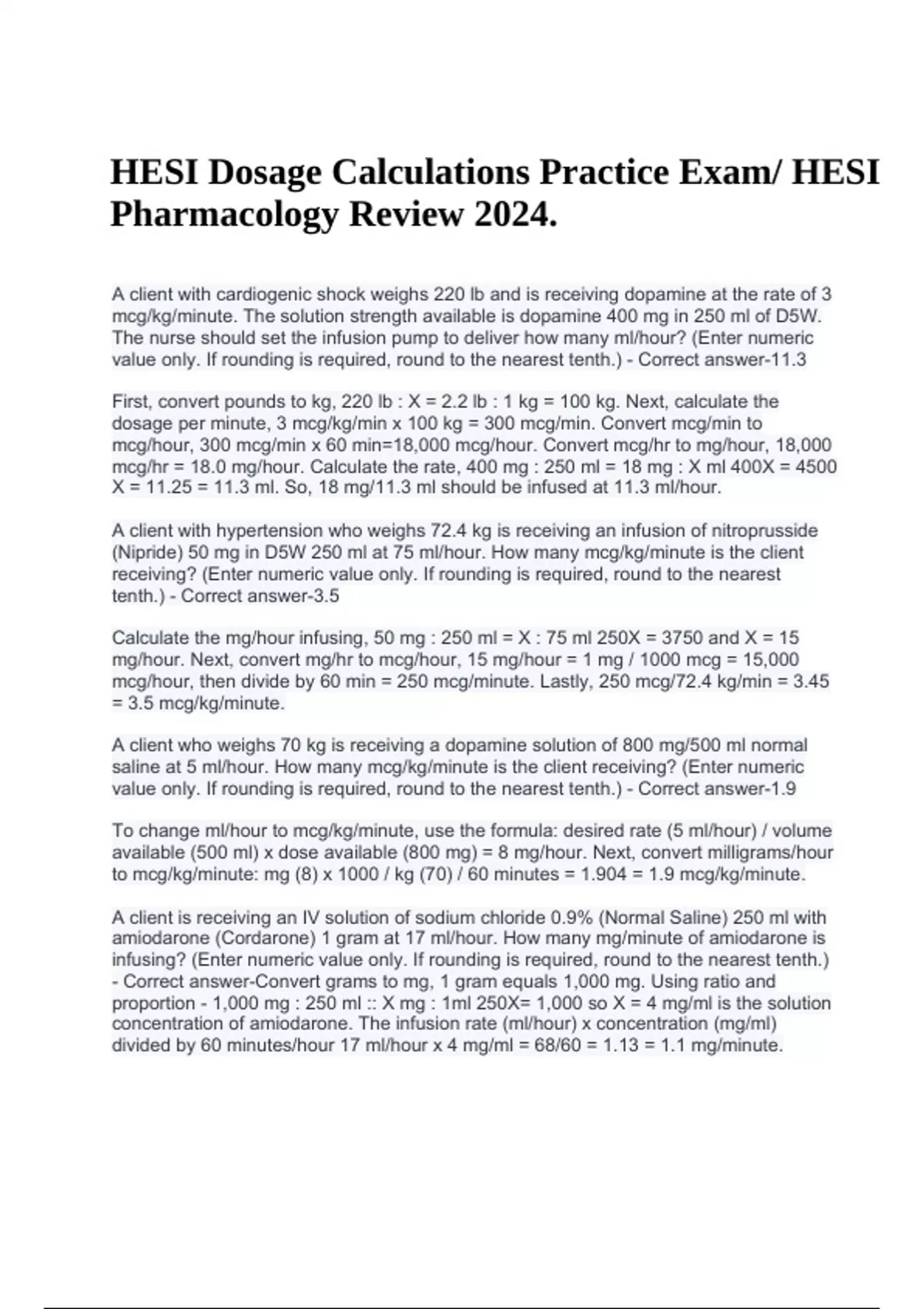 HESI Dosage Calculations Practice Exam/ HESI Pharmacology Review 2024.
