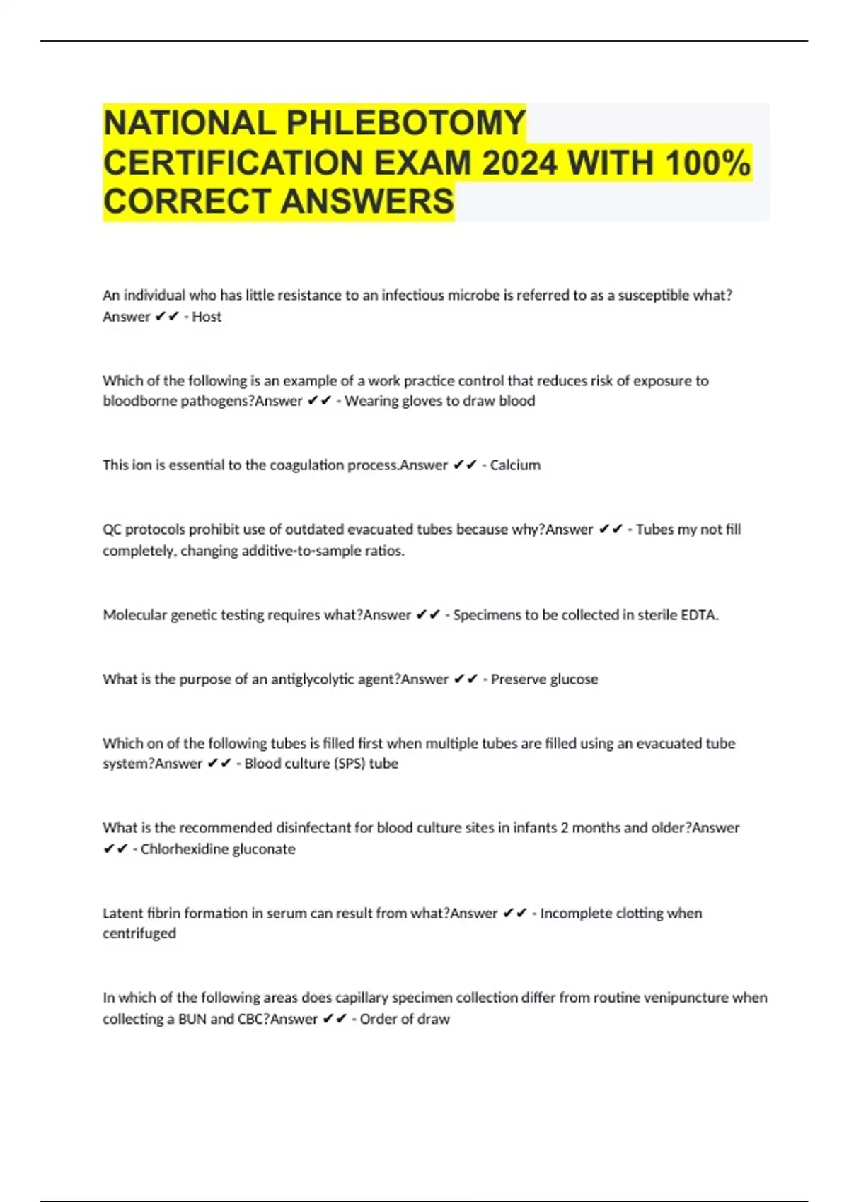 NATIONAL PHLEBOTOMY CERTIFICATION EXAM 2024 WITH 100% CORRECT ANSWERS