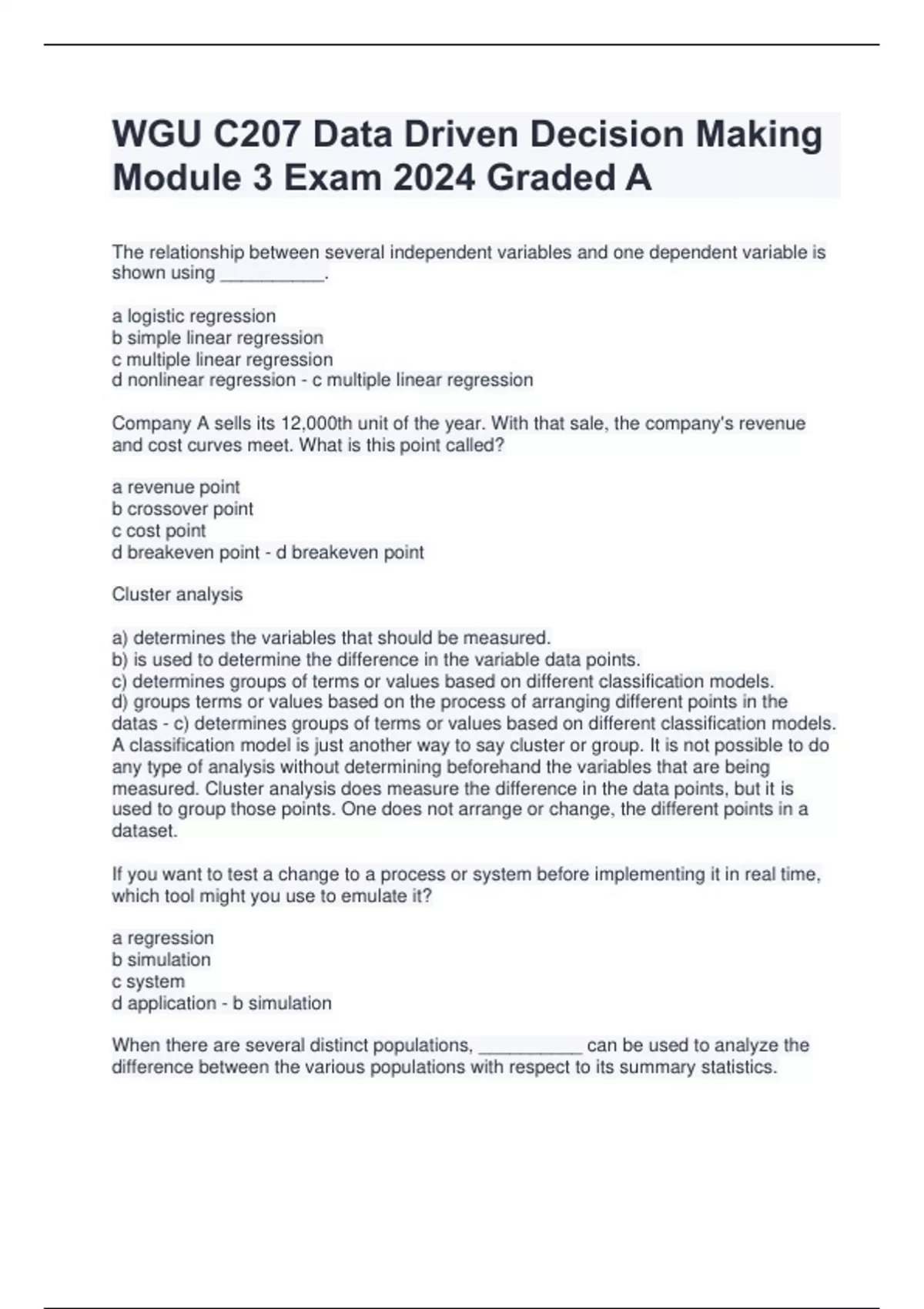 The relationship between several independent variables and one dependent variable is shown using __________. a logistic regression b simple linear regression c multiple linear regression d nonlinear regression - c multiple linear regression Company A sells its 12,000th unit of the year. With that sale, the company's revenue and cost curves meet. What is this point called? a revenue point b crossover point c cost point d breakeven point - d breakeven point Cluster analysis a) determines the variables that should be measured. b) is used to determine the difference in the variable data points. c) determines groups of terms or values based on different classification models. d) groups terms or values based on the process of arranging different points in the datas - c) determines groups of terms or values based on different classification models. A classification model is just another way to say cluster or group. It is not possible to do any type of analysis without determining beforehand the variables that are being measured. Cluster analysis does measure the difference in the data points, but it is used to group those points. One does not arrange or change, the different points in a dataset. If you want to test a change to a process or system before implementing it in real time, which tool might you use to emulate it? a regression b simulation c system d application - b simulation When there are several distinct populations, __________ can be used to analyze the difference between the various populations with respect to its summary statistics. a analysis of variance b crossover analysis c simple linear regression d multiple linear regression - a analysis of variance To compare populations you would use analysis of variance or ANOVA. A data point that is significantly distant from the observations in the dataset is called which of the following? a far point b error point c abnormal distribution d outlier - d outlier In a normal distribution, approximately what percentage of data points in a dataset will be within one standard deviation of the mean? a 50.4 b 68.3 c 95.4 d 99.7 - b 68.3 The strongest relationship between variables is represented by which of the following numbers? a -0.99 b -0.22 c 0.16 d 0.74 - a -0.99 The closer the correlation is to one or negative one, the stronger the relationship between variables is. A __________ linear relationship exists when the dependent variable increases as the independent variable increases. a strong b weak c positive d negative - c positive When both the dependent and independent variables rise, the relationship is said to be positive. If both variables fell, the relationship would be negative. Analysis of Variance (ANOVA) is used to measure the likelihood that a number of samples will be normally distributed. T/F - F. ANOVA is used to measure if samples from different populations are equal.