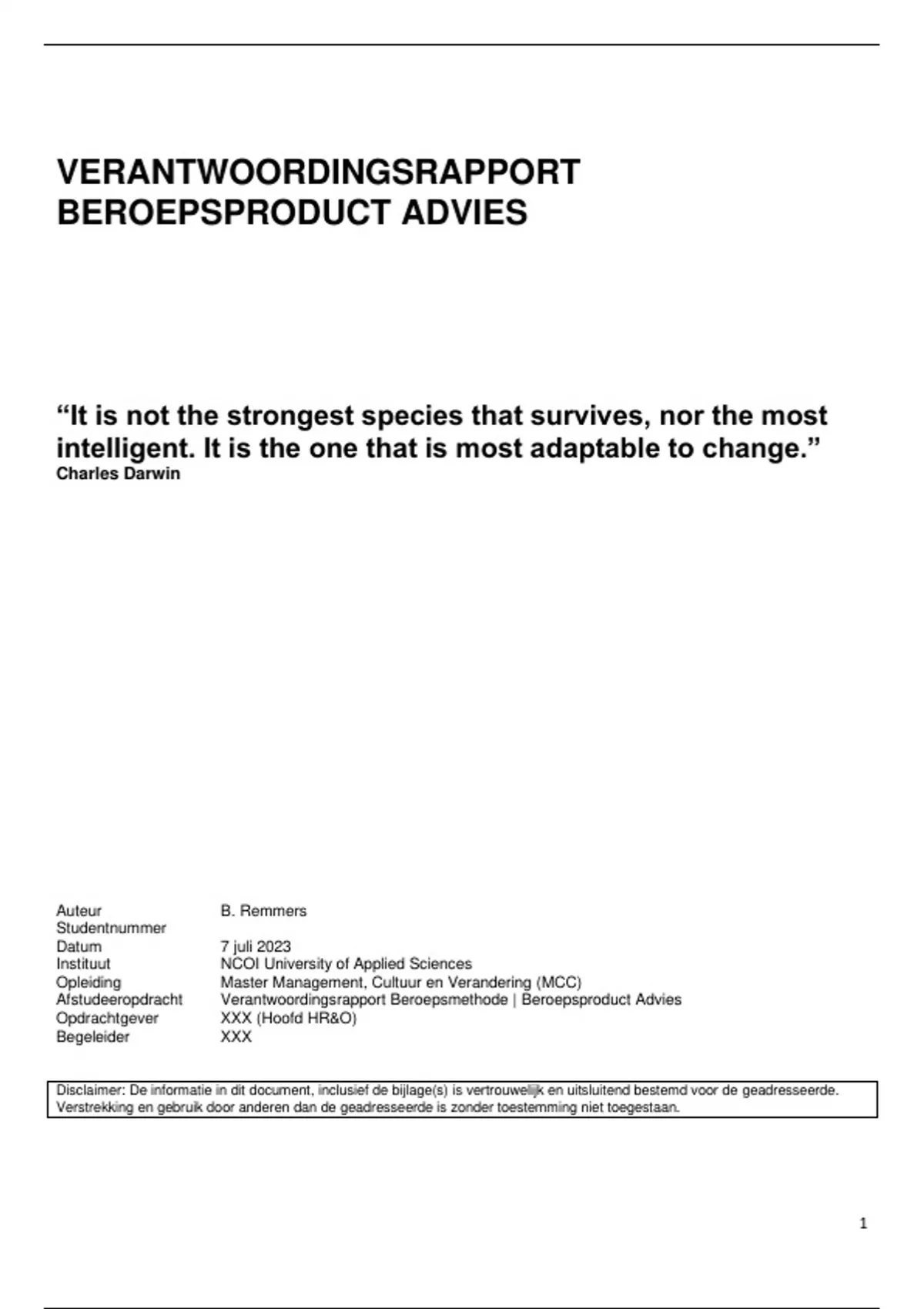 Afstudeeropdracht Verantwoordingsrapport Beroepsmethode | Beroepsproduct Advies