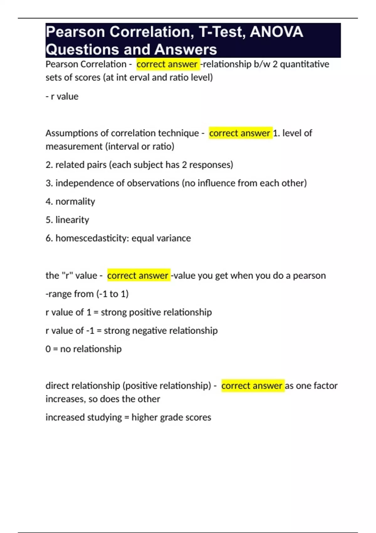 Pearson Correlation, T-Test, ANOVA Questions and Answers