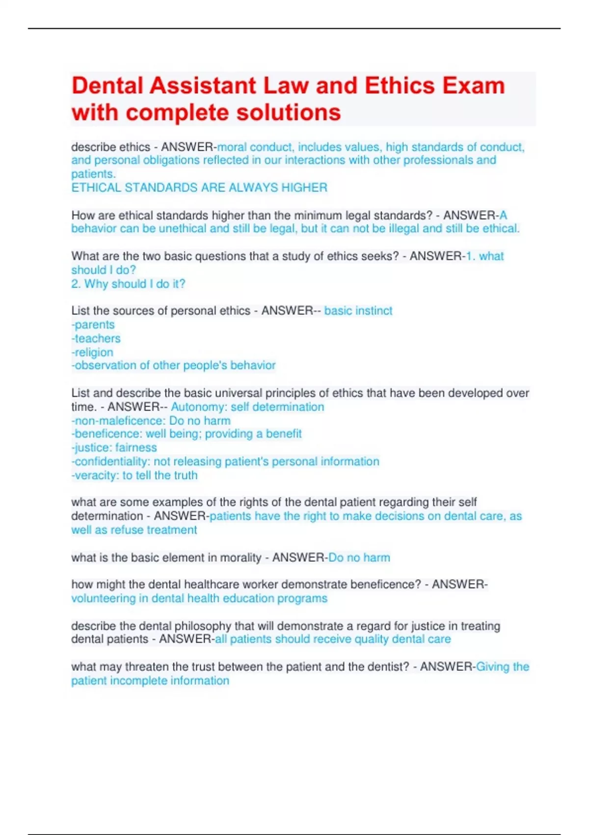 Dental Assistant Law and Ethics Exam with complete solutions describe ethics - ANSWER-moral conduct, includes values, high standards of conduct, and personal obligations reflected in our interactions with other professionals and patients. ETHICAL STANDARDS ARE ALWAYS HIGHER How are ethical standards higher than the minimum legal standards? - ANSWER-A behavior can be unethical and still be legal, but it can not be illegal and still be ethical. What are the two basic questions that a study of ethics seeks? - ANSWER-1. what should I do? 2. Why should I do it? List the sources of personal ethics - ANSWER-- basic instinct -parents -teachers -religion -observation of other people's behavior List and describe the basic universal principles of ethics that have been developed over time. - ANSWER-- Autonomy: self determination -non-maleficence: Do no harm -beneficence: well being; providing a benefit -justice: fairness -confidentiality: not releasing patient's personal information -veracity: to tell the truth what are some examples of the rights of the dental patient regarding their self determination - ANSWER-patients have the right to make decisions on dental care, as well as refuse treatment what is the basic element in morality - ANSWER-Do no harm how might the dental healthcare worker demonstrate beneficence? - ANSWER-volunteering in dental health education programs describe the dental philosophy that will demonstrate a regard for justice in treating dental patients - ANSWER-all patients should receive quality dental care what may threaten the trust between the patient and the dentist? - ANSWER-Giving the patient incomplete information is respecting a patient's privacy a legal or ethical obligation? - ANSWER-BOTH what are the legal requirements regarding suspected child or elder abuse? - ANSWER-must be reported to protect the individuals from harm what law was enacted in 1996 to put forth very definite legal requirements related to confidentiality of patient's health information? - ANSWER-HIPAA-- health insurance portability and accountability act what is required by DANB for dental assistants to remain certified and is required by states that license or register dental assistant as part of the renewal process, explain? - ANSWER-continuing education programs in order to keep the dental assistant up on their skills what are the options for obtaining continuing education? - ANSWER-- professional association meetings -home study courses/ online what establishes a guide to professional behavior? - ANSWER-code of ethics what professional organization has developed a written code of ethics for dental assistants - ANSWER-american dental assistants association why do professional organizations establish a code of ethics? - ANSWER-- demonstrate a standard of care - enhance ethical consciousness and responsibility - guide members in making informed ethical decisions - establish a standard of professional judgement what is an ethical dilemma? - ANSWER-when one or more ethical principles are in conflict what are the steps for solving an ethical dilemma? - ANSWER--identify the alternatives -determine professional implications - rank alternatives - choose course of actions