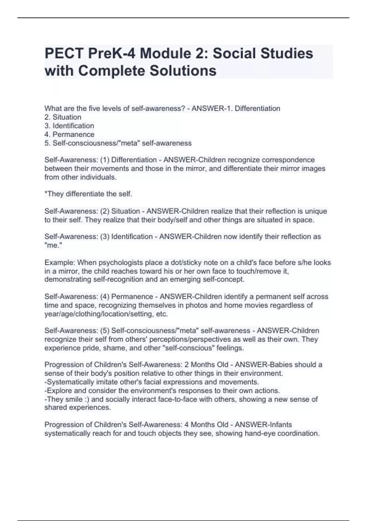 PECT PreK-4 Module 2: Social Studies with Complete SolutionsPECT PreK-4 Module 2: Social Studies with Complete SolutionsPECT PreK-4 Module 2: Social Studies with Complete Solutions What are the five levels of self-awareness? - ANSWER-1. Differentiation 2. Situation 3. Identification 4. Permanence 5. Self-consciousness/"meta" self-awareness Self-Awareness: (1) Differentiation - ANSWER-Children recognize correspondence between their movements and those in the mirror, and differentiate their mirror images from other individuals. *They differentiate the self. Self-Awareness: (2) Situation - ANSWER-Children realize that their reflection is unique to their self. They realize that their body/self and other things are situated in space. Self-Awareness: (3) Identification - ANSWER-Children now identify their reflection as "me."