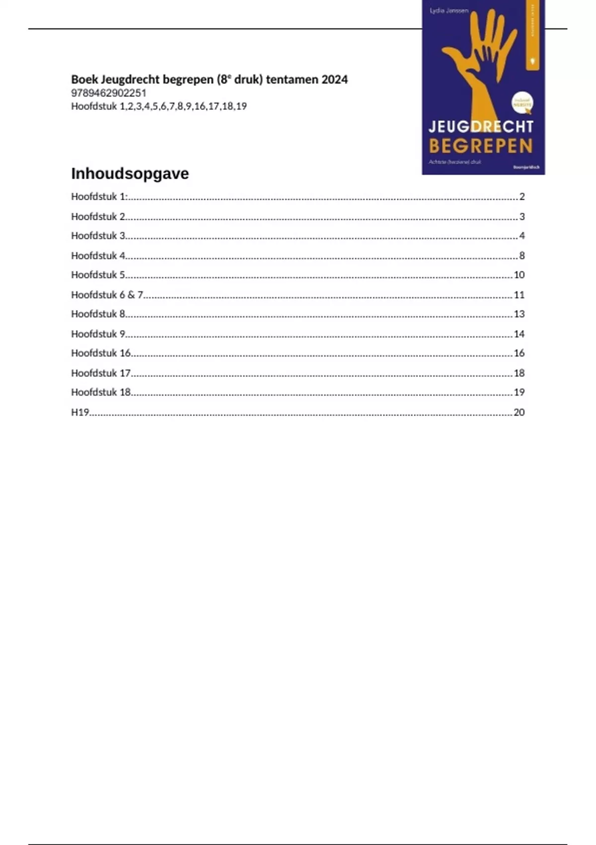 Samenvatting van het boek jeugdrecht begrepen 8e druk. Sinds dit jaar is de 8e druk uit, de vorige samenvattingen zijn allemaal van een oude druk. De hoofdstukken 1,2,3,4,5,6,7,8,9,16,17,18,19 worden behandeld. Deze hoofdstukken worden namelijk gevraagd om te leren voor het tentamen. Daarnaast wordt er ook belangrijke informatie verwerkt uit de college's die van belang zijn
