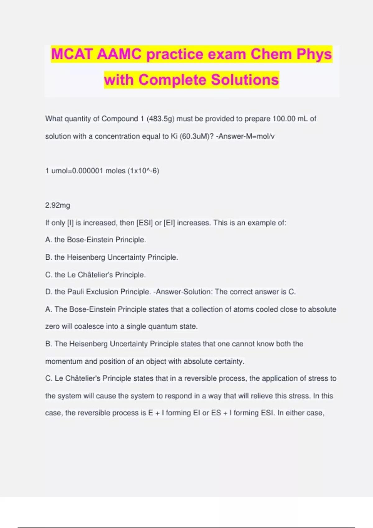 MCAT AAMC practice exam Chem Phys with Complete Solutions What quantity of Compound 1 (483.5g) must be provided to prepare 100.00 mL of solution with a concentration equal to Ki (60.3uM)? -Answer-M=mol/v 1 umol=0.000001 moles (1x10^-6) 2.92mg If only [I] is increased, then [ESI] or [EI] increases. This is an example of: A. the Bose-Einstein Principle. B. the Heisenberg Uncertainty Principle. C. the Le Châtelier's Principle. D. the Pauli Exclusion Principle. -Answer-Solution: The correct answer is C. A. The Bose-Einstein Principle states that a collection of atoms cooled close to absolute zero will coalesce into a single quantum state. B. The Heisenberg Uncertainty Principle states that one cannot know both the momentum and position of an object with absolute certainty. C. Le Châtelier's Principle states that in a reversible process, the application of stress to the system will cause the system to respond in a way that will relieve this stress. In this case, the reversible process is E + I forming EI or ES + I forming ESI. In either case, increasing [I] induces stress of the system, and the system relieves that stress by converting I to either more EI or ESI. D. The Pauli Exclusion Principle states that two or more identical fermions, e.g. electrons, cannot occupy the same quantum state. Which structural change to Compound 1 would make it more water soluble? A. Replacing benzene CH with N in the ring B. Replacing C=O with C=CH2 C. Replacing N-N=N with CH-CH=CH D. Replacing NH with NCH3 -Answer-Solution: The correct answer is A. A. Nitrogen in the benzene ring would have a lone pair that could accept a hydrogen bond from water, thus increasing the solubility of the compound. B. Replacing C=O with C=CH2 would decrease the polarity of the compound and make it less water soluble. C. Replacing N−N=N with CH−CH=CH would decrease the polarity of the compound and make it less water soluble. D. Replacing NH with NCH3 removes a hydrogen bond donor, thus decreasing water solubility. In μM•s-1 and μM, what should the approximate values of kcat/KM and Ki be, respectively, when [I] = 180 μM? -Answer-Neither is affected by a change in I, therefore they will stay the same (150 and 60.3). Ki is the equilibrium constant and is never affected by increasing I. What functional group transformation occurs in the product of the reaction catalyzed by Na+-NQR (NADH and ubiquinone)? A. RC(=O)R → RCH(OH)R B. ROPO32- → ROH + Pi C. RC(=O)NHR'→ RCOOH + R'NH2 D. RC(=O)OR'→ RCOOH + R'OH -Answer-Solution: The correct answer is A. A. This is two-electron reduction of a ketone to an alcohol, which is the reaction catalyzed by Na+-NQR. A. This is the reaction catalyzed by a phosphatase. A. This is the reaction catalyzed by a protease or amidase. A. This is the reaction catalyzed by an esterase. What is the chemical structure of a component found in four of the five cofactors (flavins) used by Na+-NQR? -Answer-Solution: The correct answer is B. A. This is the structure of adenine. It is only found in FAD. B. This is the structure of flavin, found in four of the five cofactors used by Na+-NQR. C. This is the structure of ubiquinone. It is a substrate, but not a cofactor. D. This is the structure of histidine. It is an amino acid, not a cofactor. What is the ratio of cation (0.150M) to enzyme (0.75mM) in the spectroelectrochemical experiments described in the passage? A. 1:2 B. 2:1 C. 20:1 D. 200:1 -Answer-0.150M=150mM 150/0.75= 200: 1 (D) The reaction between NADH and ubiquinone is exergonic, but the reaction, when catalyzed by Na+-NQR, does not generate much heat in vivo. What factor accounts for this difference? The reaction catalyzed by Na+-NQR in vivo: A. is more exothermic as a result of the lower activation energy. B. occurs sequentially in several small steps. C. maintains a large separation between the reacting centers. D. is coupled to the movement of a charged particle against a concentration gradient. - Answer-Solution: The correct answer is D. A. This is impossible. Even if it were true, this would make the heat generation larger, not smaller, for the catalyzed reaction. Catalysis does not change thermodynamics. B. By Hess's Law, the heat of reaction will sum and be the same. The fact that the reaction can be broken down into steps will not change the overall thermodynamics. C. This is also impossible. The reactants ultimately must be close together to react. D. The movement of a charged particle against its concentration gradient is energetically costly. Coupling the two processes: the redox reaction between NADH and ubiquinone and the movement of Na+ up a concen