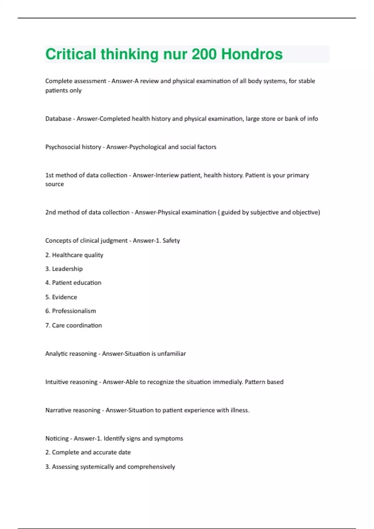 Complete assessment - Answer-A review and physical examination of all body systems, for stable patients only Database - Answer-Completed health history and physical examination, large store or bank of info Psychosocial history - Answer-Psychological and social factors 1st method of data collection - Answer-Interiew patient, health history. Patient is your primary source 2nd method of data collection - Answer-Physical examination ( guided by subjective and objective) Concepts of clinical judgment - Answer-1. Safety 2. Healthcare quality 3. Leadership 4. Patient education 5. Evidence 6. Professionalism 7. Care coordination Analytic reasoning - Answer-Situation is unfamiliar Intuitive reasoning - Answer-Able to recognize the situation immedialy. Pattern based Narrative reasoning - Answer-Situation to patient experience with illness. Noticing - Answer-1. Identify signs and symptoms 2. Complete and accurate date 3. Assessing systemically and comprehensively4. Predicting and managing patient complications 5. Identifying assumptions Interpreting - Answer-Understanding of the situation Responding - Answer-Based on what you interpreted the nurse will determine appropriate actions Reflection in action - Answer-Observing patient reaction to the action the nurse chose and deciding if the situation was fixed Reflection on action - Answer-Patient responses to the outcomes. Nursing refelection after the situation was solved Novice nurse - Answer-Uses analytic reasoning. Uses textbook in a systemic analysis of a situation Expert nurse - Answer-Uses intuitive reasoing. Recognizes patterns immediatly. Able to look at the big picture Assessment - Answer-Collecting and analyzing data from the patient, family members, health care team Who does the initial assessment - Answer-RN Focused assessment - Answer-Used to gather information on a specific problem Head to toe assessment - Answer-Systemic approach so you dont miss something Objective data - Answer-What you can observe or measure. Also known as signs Subjective data - Answer-Can not be measured. What the patient is feeling. Also known as symptomsClinical judgment - Answer-Interpretation or conclusion about a patients needs, concerns or health problems, and/or the decision to take action ( or not) use or modify standard approaches, or improvise as one deems appropriate to the patients response Reasoning - Answer-Leads to clinical judgment