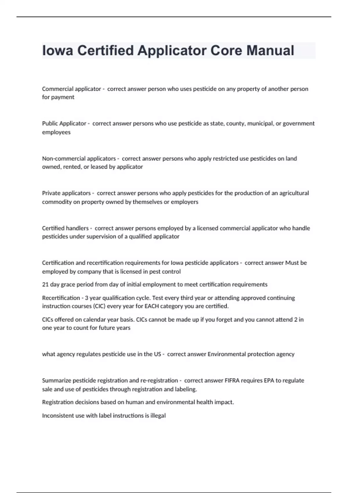 Iowa Certified Applicator Core ManualCommercial applicator - correct answer person who uses pesticide on any property of another person for payment Public Applicator - correct answer persons who use pesticide as state, county, municipal, or government employees Non-commercial applicators - correct answer persons who apply restricted use pesticides on land owned, rented, or leased by applicator Private applicators - correct answer persons who apply pesticides for the production of an agricultural commodity on property owned by themselves or employers Certified handlers - correct answer persons employed by a licensed commercial applicator who handle pesticides under supervision of a qualified applicator Certification and recertification requirements for Iowa pesticide applicators - correct answer Must be employed by company that is licensed in pest control 21 day grace period from day of initial employment to meet certification requirements Recertification - 3 year qualification cycle. Test every third year or attending approved continuing instruction courses (CIC) every year for EACH category you are certified. CICs offered on calendar year basis. CICs cannot be made up if you forget and you cannot attend 2 in one year to count for future years what agency regulates pesticide use in the US - correct answer Environmental protection agency Summarize pesticide registration and re-registration - correct answer FIFRA requires EPA to regulate sale and use of pesticides through registration and labeling. Registration decisions based on human and environmental health impact. Inconsistent use with label instructions is illegal