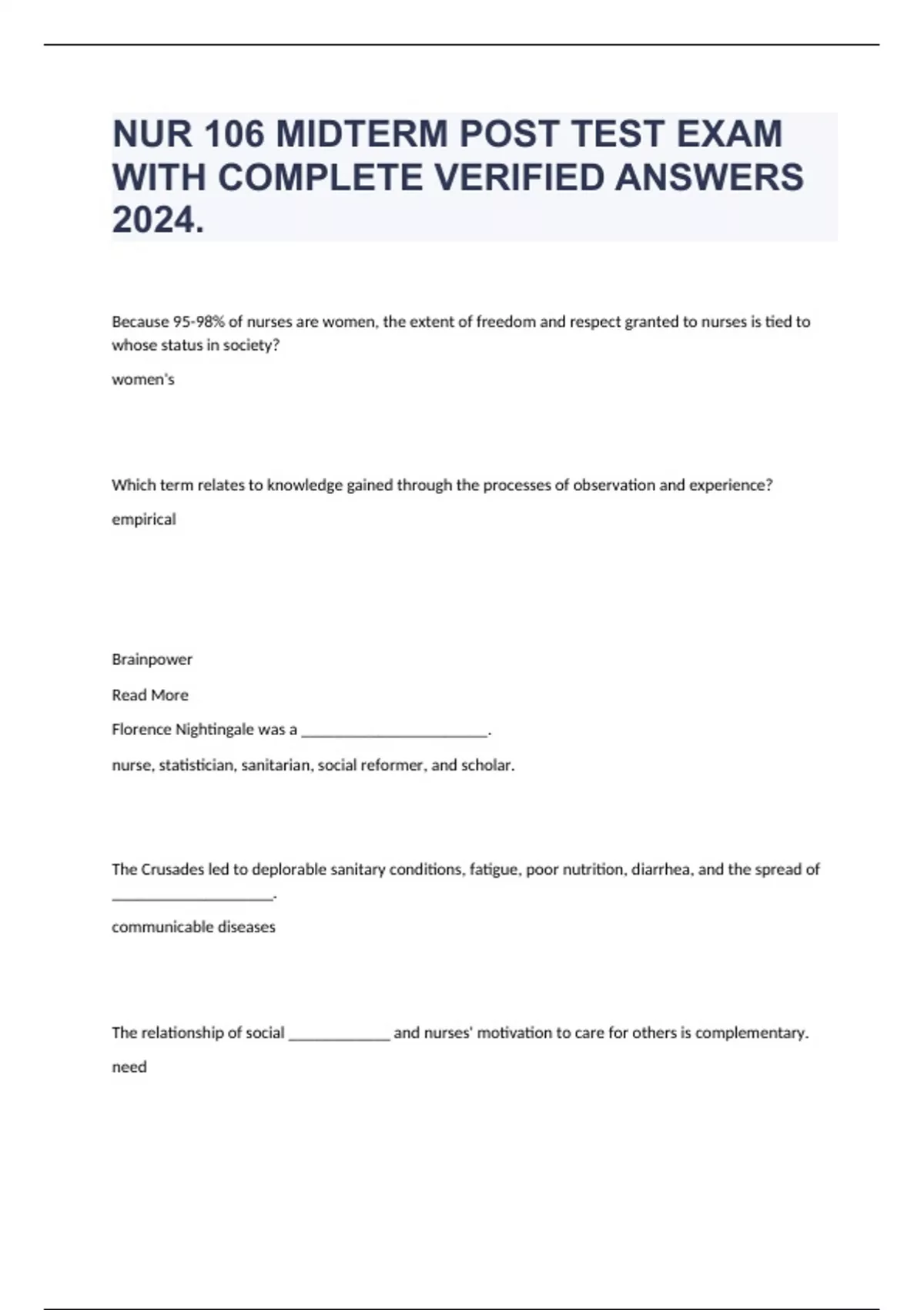 Because 95-98% of nurses are women, the extent of freedom and respect granted to nurses is tied to whose status in society? women's Which term relates to knowledge gained through the processes of observation and experience? empirical Brainpower Read More Florence Nightingale was a ______________________. nurse, statistician, sanitarian, social reformer, and scholar. The Crusades led to deplorable sanitary conditions, fatigue, poor nutrition, diarrhea, and the spread of ___________________. communicable diseases The relationship of social ____________ and nurses' motivation to care for others is complementary. need