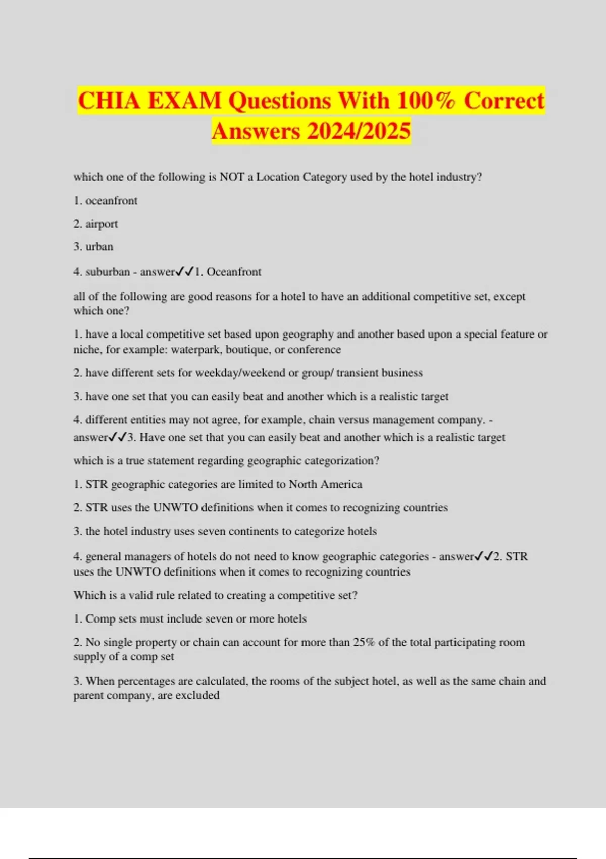 CHIA EXAM Questions With 100% Correct Answers 2024/2025 which one of the following is NOT a Location Category used by the hotel industry? 1. oceanfront 2. airport 3. urban 4. suburban - answer1. Oceanfront all of the following are good reasons for a hotel to have an additional competitive set, except which one? 1. have a local competitive set based upon geography and another based upon a special feature or niche, for example: waterpark, boutique, or conference 2. have different sets for weekday/weekend or group/ transient business 3. have one set that you can easily beat and another which is a realistic target 4. different entities may not agree, for example, chain versus management company. - answer3. Have one set that you can easily beat and another which is a realistic target which is a true statement regarding geographic categorization? 1. STR geographic categories are limited to North America 2. STR uses the UNWTO definitions when it comes to recognizing countries 3. the hotel industry uses seven continents to categorize hotels 4. general managers of hotels do not need to know geographic categories - answer2. STR uses the UNWTO definitions when it comes to recognizing countries Which is a valid rule related to creating a competitive set? 1. Comp sets must include seven or more hotels 2. No single property or chain can account for more than 25% of the total participating room supply of a comp set 3. When percentages are calculated, the rooms of the subject hotel, as well as the same chain and parent company, are excluded 4. You cannot have more than 20 hotels in your comp set - answer3. When percentages are calculated, the rooms of the subject hotel, as well as the same chain and parent company, are excluded Which one of the following is an accurate statement regarding Scale and Class groups and a single chain? 1. A Ritz Carlton hotel will always be in the same Scale and Class groups in every country throughout the world 2. A Ritz Carlson hotel in the US can be in one Class group and a Ritz Carlton hotel in Japan can be in a different Class group 3. A Ritz Carlton hotel in the US can be in one Scale group and a Ritz Carlton hotel in Japan can be in a different Scale group 4. Ritz Carlton may choose which Scale and which Class they are in - answer1. A Ritz Carlton hotel will always be in the same Scale and Class groups in every country throughout the world When can a competitive set be created? 1. A competitive set may be created three months before a hotel opens 2. A competitive set may be created while the hotel is under construction 3. A competitive set may be created on the one year anniversary of a hotel's opening 4. A competitive set may be created once the hotel has opened - answer2. A competitive set may be created while the hotel is under construction Most of the entities below are classified as "Chains". Which one is a "Parent Company" consisting of multiple chains? 1. Holiday Inn Express 2. Hampton Inn 3. Hilton Worldwide 4. Radisson Blu - answer3. Hilton Worldwide Which is a true statement regarding markets? 1. A country would never have more than 100 markets and never have less than 2 markets 2. Markets include hotels that are in big cities, not rural areas 3. There is another name for Markets outside the U.S. 4. No market will ever cross country boundaries - answer4. No market will ever cross country boundar