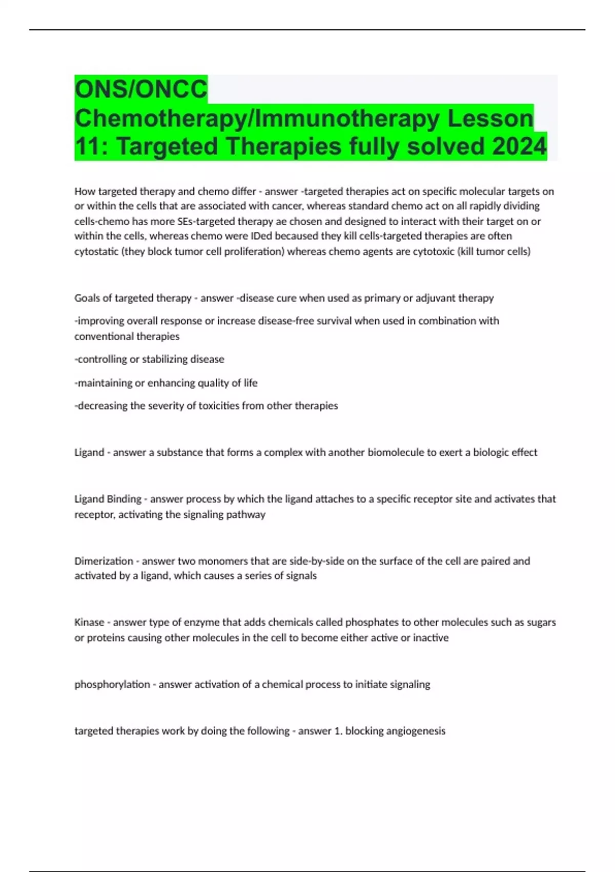 ONS/ONCC Chemotherapy/Immunotherapy Lesson 11: Targeted Therapies fully solved 2024