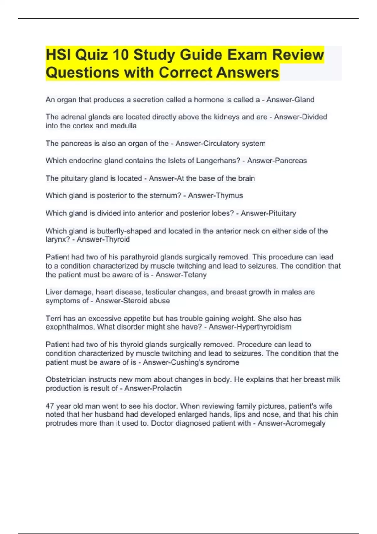 HSI Quiz 10 Study Guide Exam Review Questions with Correct Answers Liver damage, heart disease, testicular changes, and breast growth in males are symptoms of - Answer-Steroid abuse Terri has an excessive appetite but has trouble gaining weight. She also has exophthalmos. What disorder might she have? - Answer-Hyperthyroidism Patient had two of his thyroid glands surgically removed. Procedure can lead to condition characterized by muscle twitching and lead to seizures. The condition that the patient must be aware of is - Answer-Cushing's syndrome Obstetrician instructs new mom about changes in body. He explains that her breast milk production is result of - Answer-Prolactin
