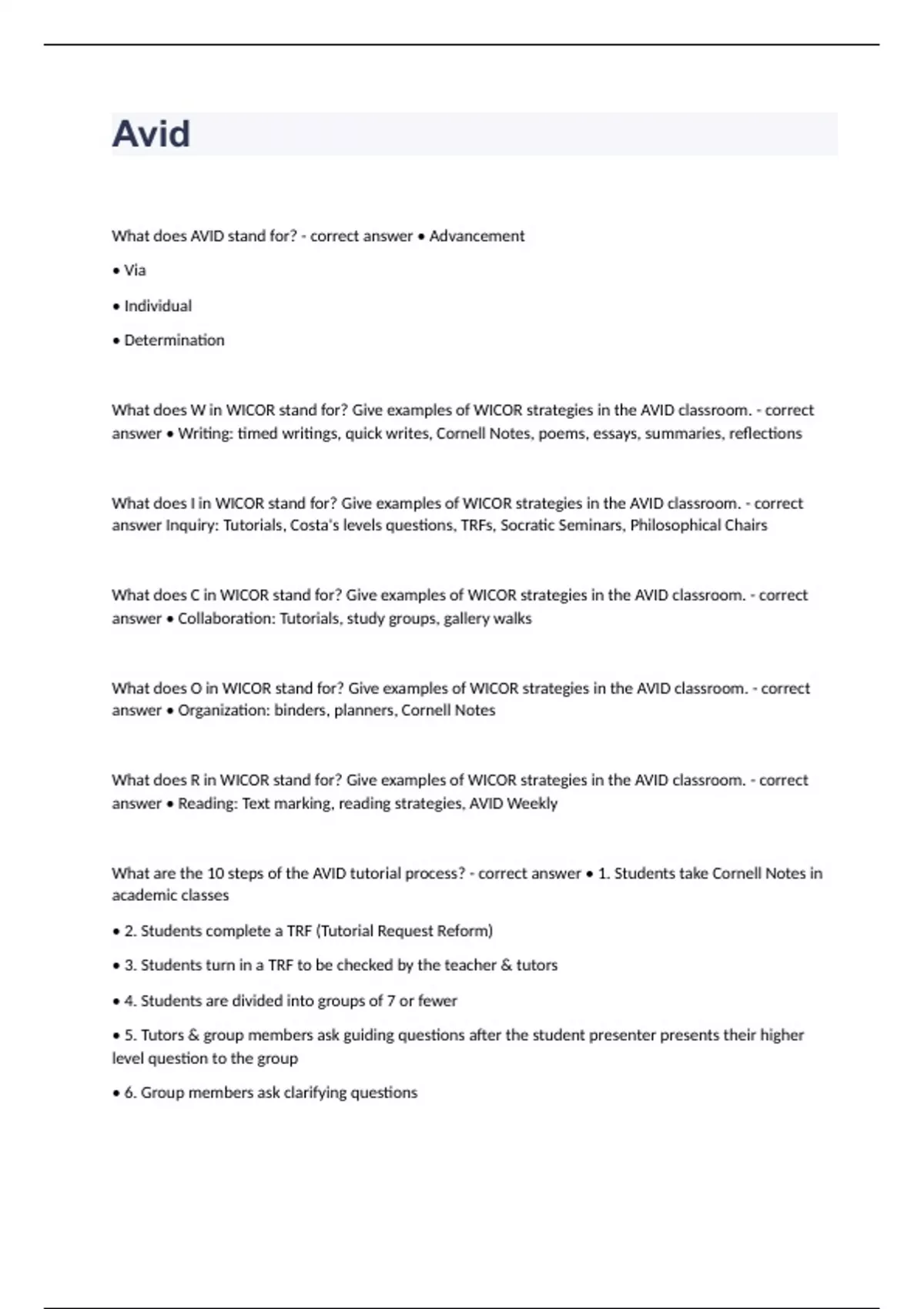 What does AVID stand for? - correct answer • Advancement • Via • Individual • Determination What does W in WICOR stand for? Give examples of WICOR strategies in the AVID classroom. - correct answer • Writing: timed writings, quick writes, Cornell Notes, poems, essays, summaries, reflections What does I in WICOR stand for? Give examples of WICOR strategies in the AVID classroom. - correct answer Inquiry: Tutorials, Costa's levels questions, TRFs, Socratic Seminars, Philosophical Chairs What does C in WICOR stand for? Give examples of WICOR strategies in the AVID classroom. - correct answer • Collaboration: Tutorials, study groups, gallery walks What does O in WICOR stand for? Give examples of WICOR strategies in the AVID classroom. - correct answer • Organization: binders, planners, Cornell Notes What does R in WICOR stand for? Give examples of WICOR strategies in the AVID classroom. - correct answer • Reading: Text marking, reading strategies, AVID Weekly What are the 10 steps of the AVID tutorial process? - correct answer • 1. Students take Cornell Notes in academic classes • 2. Students complete a TRF (Tutorial Request Reform) • 3. Students turn in a TRF to be checked by the teacher & tutors • 4. Students are divided into groups of 7 or fewer • 5. Tutors & group members ask guiding questions after the student presenter presents their higher level question to the group • 6. Group members ask clarifying questions