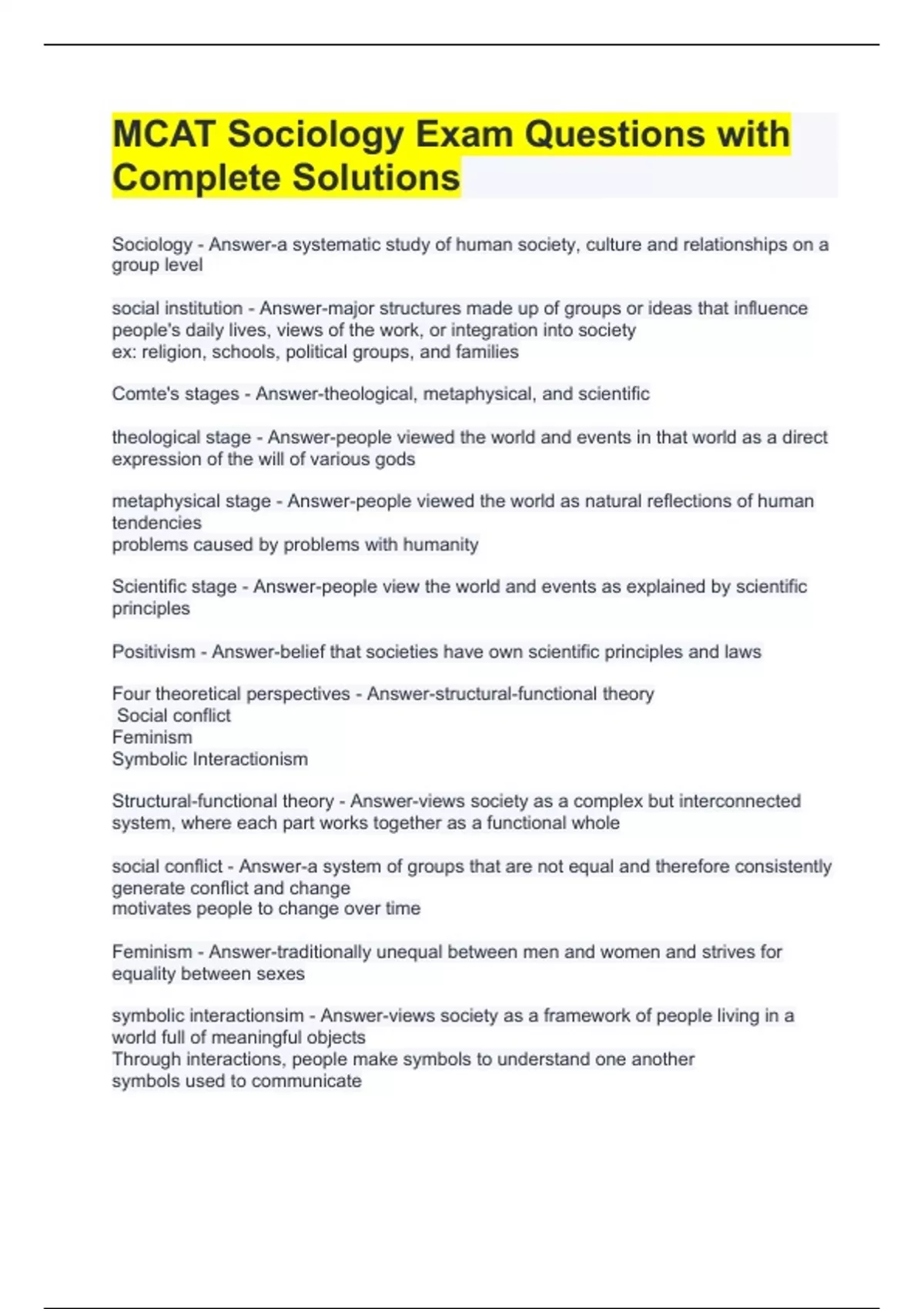 Sociology - Answer-a systematic study of human society, culture and relationships on a group level social institution - Answer-major structures made up of groups or ideas that influence people's daily lives, views of the work, or integration into society ex: religion, schools, political groups, and families Comte's stages - Answer-theological, metaphysical, and scientific theological stage - Answer-people viewed the world and events in that world as a direct expression of the will of various gods metaphysical stage - Answer-people viewed the world as natural reflections of human tendencies problems caused by problems with humanity Scientific stage - Answer-people view the world and events as explained by scientific principles Positivism - Answer-belief that societies have own scientific principles and laws Four theoretical perspectives - Answer-structural-functional theory Social conflict Feminism Symbolic Interactionism Structural-functional theory - Answer-views society as a complex but interconnected system, where each part works together as a functional whole social conflict - Answer-a system of groups that are not equal and therefore consistently generate conflict and change motivates people to change over time Feminism - Answer-traditionally unequal between men and women and strives for equality between sexes symbolic interactionsim - Answer-views society as a framework of people living in a world full of meaningful objects Through interactions, people make symbols to understand one another symbols used to communicate