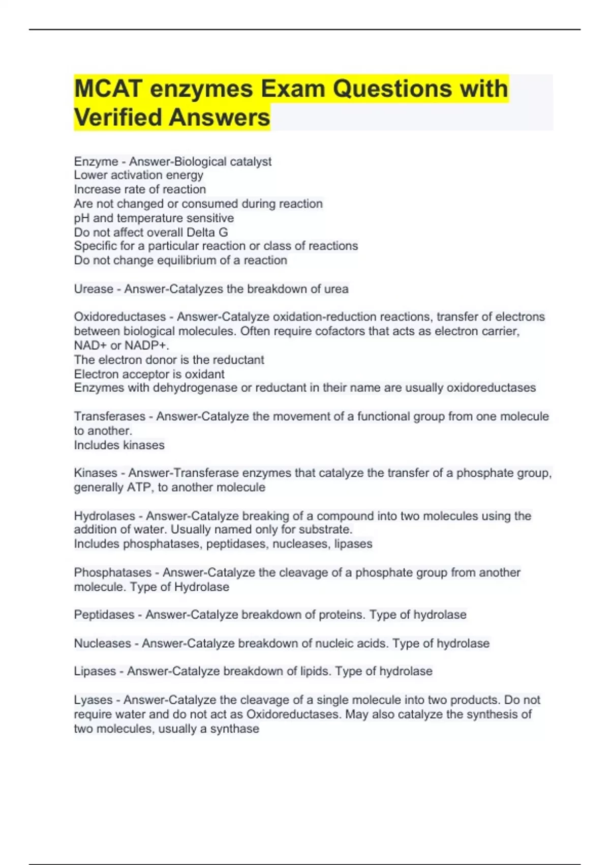 Enzyme - Answer-Biological catalyst Lower activation energy Increase rate of reaction Are not changed or consumed during reaction pH and temperature sensitive Do not affect overall Delta G Specific for a particular reaction or class of reactions Do not change equilibrium of a reaction Urease - Answer-Catalyzes the breakdown of urea Oxidoreductases - Answer-Catalyze oxidation-reduction reactions, transfer of electrons between biological molecules. Often require cofactors that acts as electron carrier, NAD+ or NADP+. The electron donor is the reductant Electron acceptor is oxidant Enzymes with dehydrogenase or reductant in their name are usually oxidoreductases Transferases - Answer-Catalyze the movement of a functional group from one molecule to another. Includes kinases Kinases - Answer-Transferase enzymes that catalyze the transfer of a phosphate group, generally ATP, to another molecule Hydrolases - Answer-Catalyze breaking of a compound into two molecules using the addition of water. Usually named only for substrate. Includes phosphatases, peptidases, nucleases, lipases Phosphatases - Answer-Catalyze the cleavage of a phosphate group from another molecule. Type of Hydrolase Peptidases - Answer-Catalyze breakdown of proteins. Type of hydrolase Nucleases - Answer-Catalyze breakdown of nucleic acids. Type of hydrolase Lipases - Answer-Catalyze breakdown of lipids. Type of hydrolase Lyases - Answer-Catalyze the cleavage of a single molecule into two products. Do not require water and do not act as Oxidoreductases. May also catalyze the synthesis of two molecules, usually a synthase