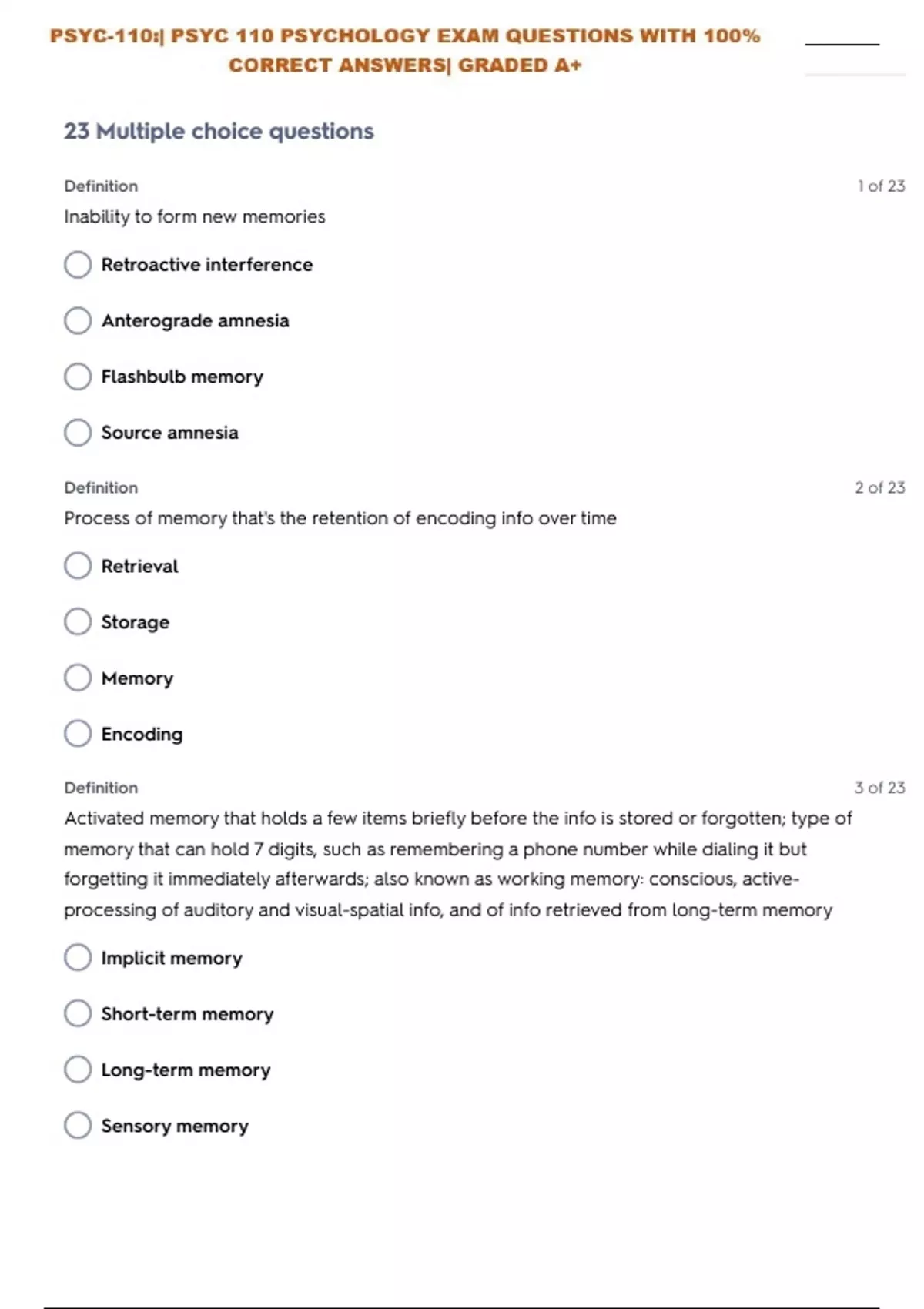 PSYC-110:| PSYC 110 PSYCHOLOGY MEMORY EXAM QUESTIONS WITH CORRECT ANSWERS
