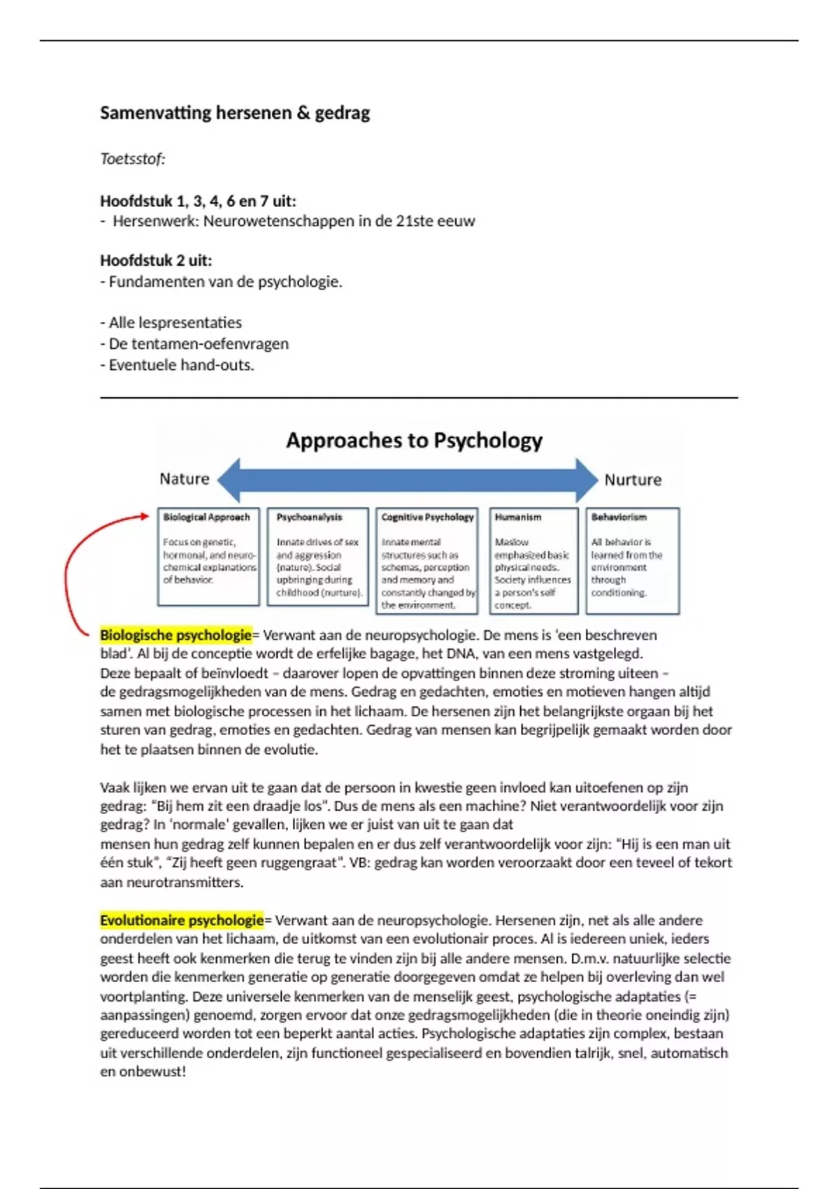 Complete samenvatting van het vak Hersenen en Gedrag van de minor inleiding in de toegepaste Psychologie aan de HU. Alles van de toetsstof (uit boeken en lespresentaties) staat in de samenvatting!! Toetsstof van het tentamen: Hoofdstuk 1, 3, 4, 6 en 7 uit: - Hersenwerk: Neurowetenschappen in de 21ste eeuw Hoofdstuk 2 uit: - Fundamenten van de psychologie. - Alle lespresentaties - De tentamen-oefenvragen - Eventuele hand-outs. Ik heb het vak afgerond met een 8.1. Minor gevolgd in het 2e semester van leerjaar 2022/2023.
