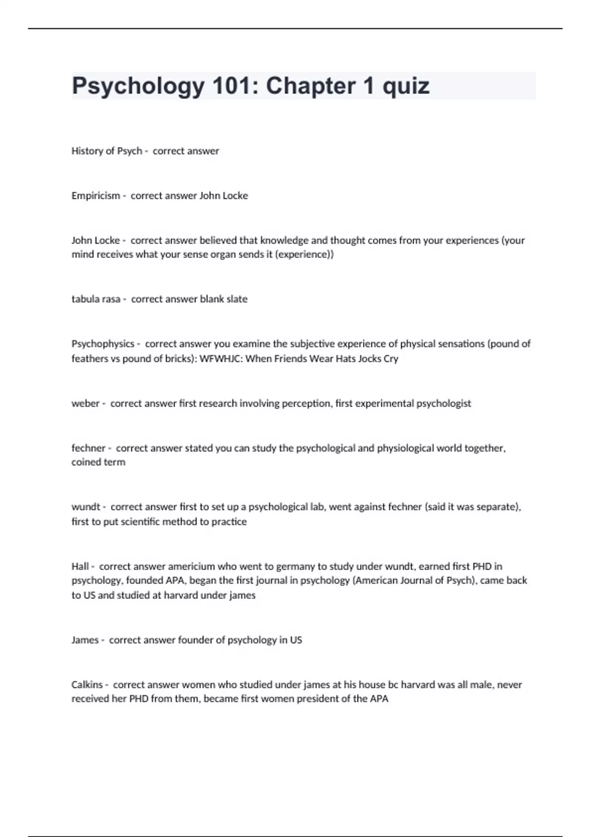Psychology 101: Chapter 1 quizHistory of Psych - correct answer Empiricism - correct answer John Locke John Locke - correct answer believed that knowledge and thought comes from your experiences (your mind receives what your sense organ sends it (experience)) tabula rasa - correct answer blank slate Psychophysics - correct answer you examine the subjective experience of physical sensations (pound of feathers vs pound of bricks): WFWHJC: When Friends Wear Hats Jocks Cry weber - correct answer first research involving perception, first experimental psychologist fechner - correct answer stated you can study the psychological and physiological world together, coined term wundt - correct answer first to set up a psychological lab, went against fechner (said it was separate), first to put scientific method to practice Hall - correct answer americium who went to germany to study under wundt, earned first PHD in psychology, founded APA, began the first journal in psychology (American Journal of Psych), came back to US and studied at harvard under james James - correct answer founder of psychology in US Calkins - correct answer women who studied under james at his house bc harvard was all male, never received her PHD from them, became first women president of the APA