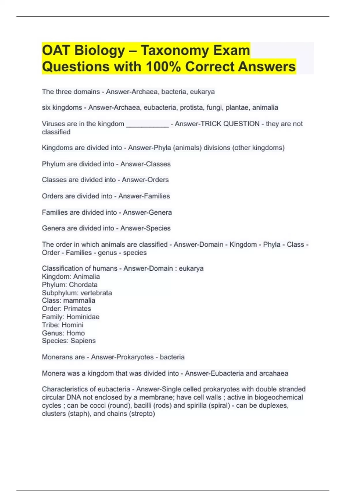 The three domains - Answer-Archaea, bacteria, eukarya six kingdoms - Answer-Archaea, eubacteria, protista, fungi, plantae, animalia Viruses are in the kingdom ___________ - Answer-TRICK QUESTION - they are not classified Kingdoms are divided into - Answer-Phyla (animals) divisions (other kingdoms) Phylum are divided into - Answer-Classes Classes are divided into - Answer-Orders Orders are divided into - Answer-Families Families are divided into - Answer-Genera Genera are divided into - Answer-Species The order in which animals are classified - Answer-Domain - Kingdom - Phyla - Class - Order - Families - genus - species Classification of humans - Answer-Domain : eukarya Kingdom: Animalia Phylum: Chordata Subphylum: vertebrata Class: mammalia Order: Primates Family: Hominidae Tribe: Homini Genus: Homo Species: Sapiens Monerans are - Answer-Prokaryotes - bacteria Monera was a kingdom that was divided into - Answer-Eubacteria and arcahaea Characteristics of eubacteria - Answer-Single celled prokaryotes with double stranded circular DNA not enclosed by a membrane; have cell walls ; active in biogeochemical cycles ; can be cocci (round), bacilli (rods) and spirilla (spiral) - can be duplexes, clusters (staph), and chains (strepto)