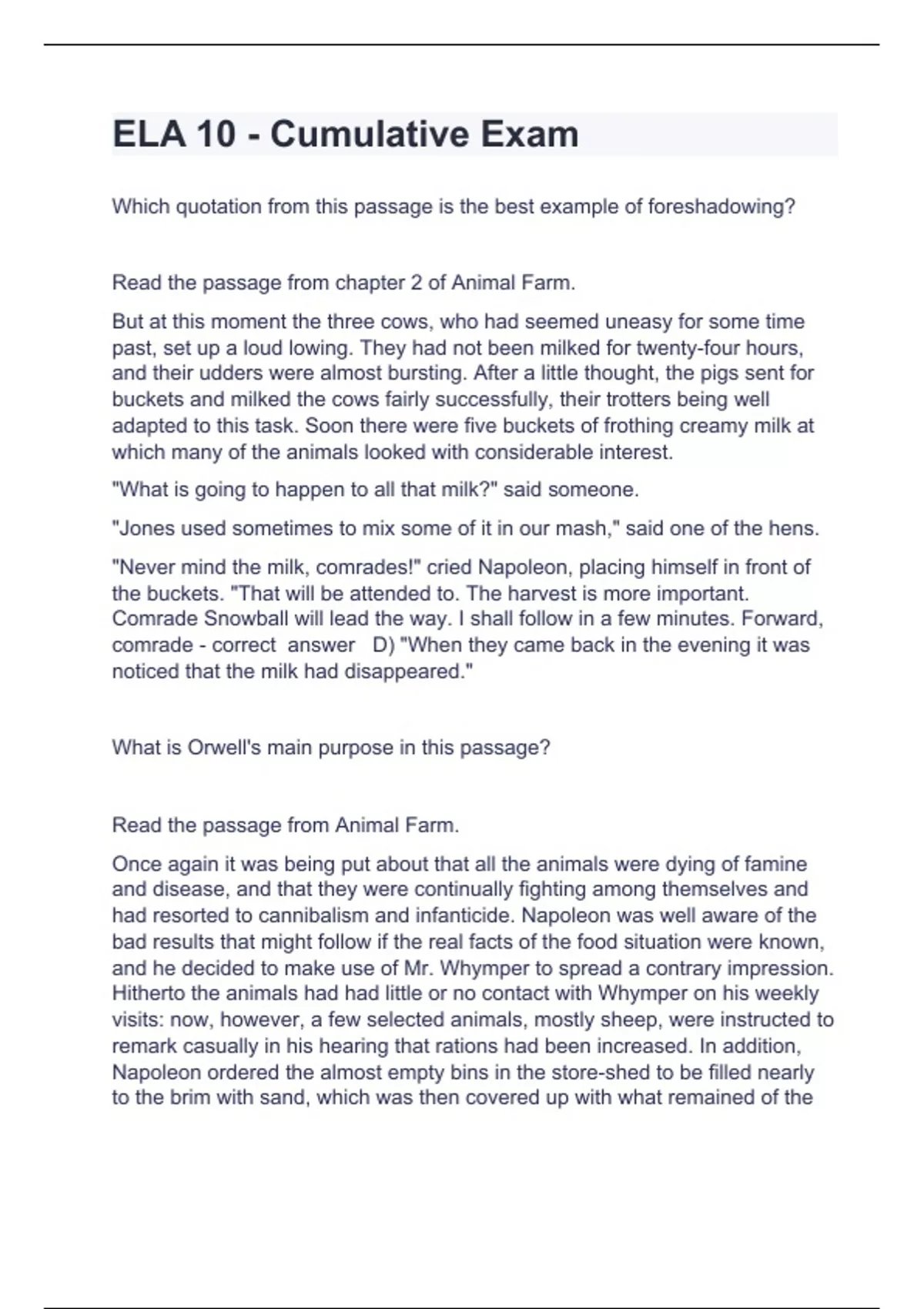 ELA 10 Question and answers correctly solved 2024/2025Which quotation from this passage is the best example of foreshadowing? Read the passage from chapter 2 of Animal Farm. But at this moment the three cows, who had seemed uneasy for some time past, set up a loud lowing. They had not been milked for twenty-four hours, and their udders were almost bursting. After a little thought, the pigs sent for buckets and milked the cows fairly successfully, their trotters being well adapted to this task. Soon there were five buckets of frothing creamy milk at which many of the animals looked with considerable interest. "What is going to happen to all that milk?" said someone. "Jones used sometimes to mix some of it in our mash," said one of the hens. "Never mind the milk, comrades!" cried Napoleon, placing himself in front of the buckets. "That will be attended to. The harvest is more important. Comrade Snowball will lead the way. I shall follow in a few minutes. Forward, comrade - correct answer D) "When they came back in the evening it was noticed that the milk had disappeared." What is Orwell's main purpose in this passage? Read the passage from Animal Farm. Once again it was being put about that all the animals were dying of famine and disease, and that they were continually fighting among themselves and had resorted to cannibalism and infanticide. Napoleon was well aware of the bad results that might follow if the real facts of the food situation were known, and he decided to make use of Mr. Whymper to spread a contrary impression. Hitherto the animals had had little or no contact with Whymper on his weekly visits: now, however, a few selected animals, mostly sheep, were instructed to remark casually in his hearing that rations had been increased. In addition, Napoleon ordered the almost empty bins in the store-shed to be filled nearly to the brim with sand, wh