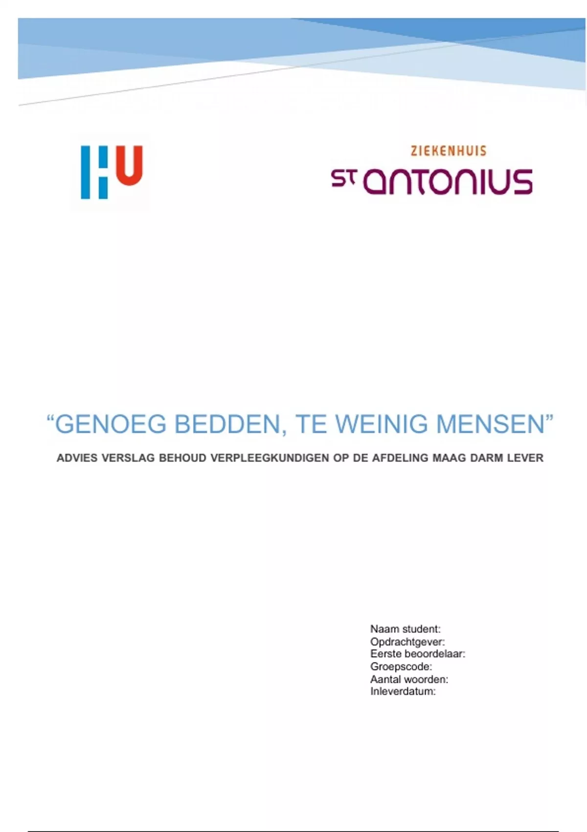 Adviesverslag/onderzoek over het behoud van verpleegkundigen. Afstudeeronderzoek is gehouden op afdeling A3/C3 MDL in het St. Antoniusziekenhuis. Cijfer 7,5.