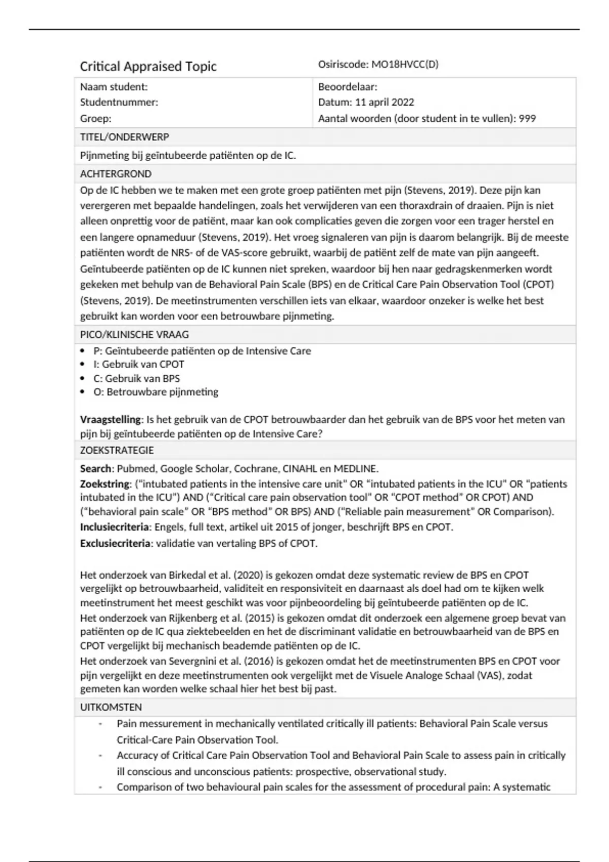 Het onderzoek van Severgnini et al. (2016) is gekozen omdat het de meetinstrumenten BPS en CPOT voor