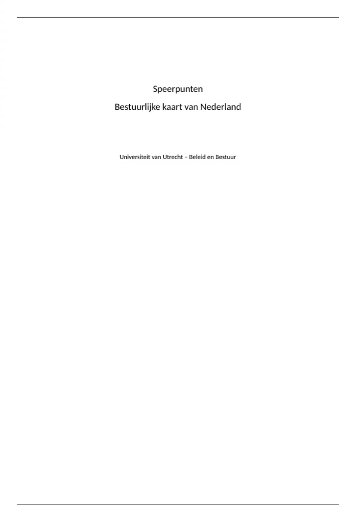 Het boek 'De Bestuurlijke Kaart van Nederland' is samengevat in dit document. Voor elk hoofdstuk zijn de speerpunten uitgezet en uitgelegd. Begrippen zijn in kleine letters toegelicht. Er wordt gebruik gemaakt van zowel lopende tekst en bullets voor het overzicht en gemakkelijk onthouden. Teksten zijn niet te lang en begrijpelijk; helpt mij beter met het onthouden. Voorbeelden zijn weggelaten, deze kan je in het boek vinden.