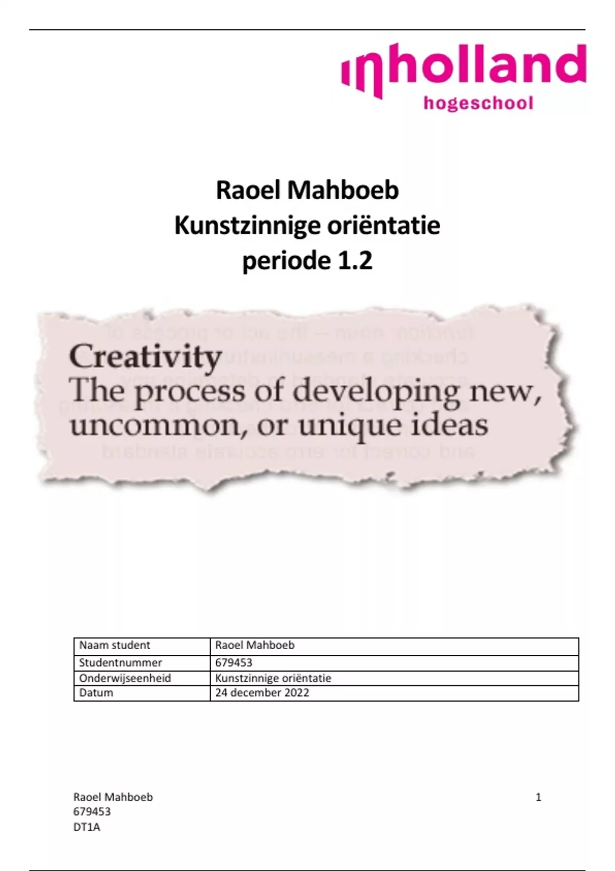 Hierbij mijn versie van Basisportfolio kunstzinnige oriëntatie. Dit verslag is gemaakt in het kader van mijn studie aan de PABO InHolland. Het verslag is beoordeeld met een 7.7. Niet 1 op 1 overnemen, maar haal er vooral je inspiratie uit.