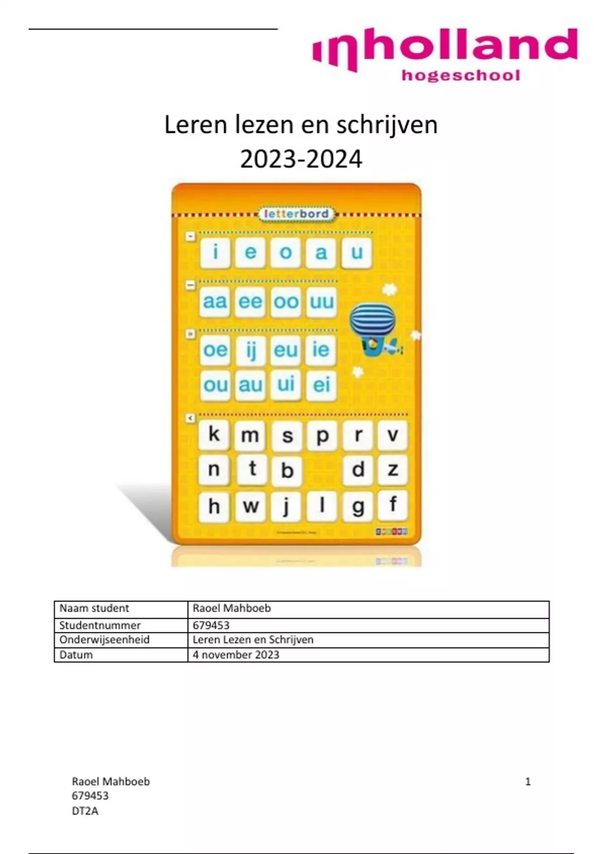 Hierbij mijn versie van Leren lezen en schrijven. Dit verslag is gemaakt in het kader van mijn studie aan de PABO InHolland. Het verslag is beoordeeld met een 7.6. Niet 1 op 1 overnemen, maar haal er vooral je inspiratie uit.