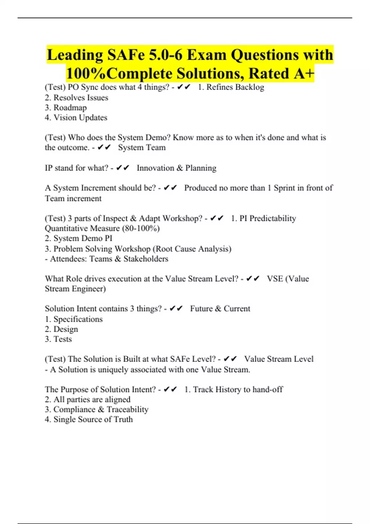 (Test) PO Sync does what 4 things? - 1. Refines Backlog 2. Resolves Issues 3. Roadmap 4. Vision Updates (Test) Who does the System Demo? Know more as to when it's done and what is the outcome. - System Team IP stand for what? - Innovation & Planning A System Increment should be? - Produced no more than 1 Sprint in front of Team increment (Test) 3 parts of Inspect & Adapt Workshop? - 1. PI Predictability Quantitative Measure (80-100%) 2. System Demo PI 3. Problem Solving Workshop (Root Cause Analysis) - Attendees: Teams & Stakeholders What Role drives execution at the Value Stream Level? - VSE (Value Stream Engineer) Solution Intent contains 3 things? - Future & Current 1. Specifications 2. Design 3. Tests (Test) The Solution is Built at what SAFe Level? - Value Stream Level - A Solution is uniquely associated with one Value Stream. The Purpose of Solution Intent? - 1. Track History to hand-off 2. All parties are aligned 3. Compliance & Traceability 4. Single Source of Truth (Test) Fixed and Variable Intent is done with? Know more about enablers. - Enablers What are the 2 types of Customers? - Direct (customer that will directly use the solution) In-Direct (The Solution builder is the Proxy) (Test) Value Stream Alignment at the PI Level via what 2 things? Who attends each meeting? - Pre & Post PI Meetings - Pre-Meeting builds an aligned plan for the next PI & match solution demand to ART capabilities. Output: Set of features for every ART; Updates ART Visions. - Post-Meeting reviews, recaps, communicates, and provides feedback. Output: Value Stream PI Objectives; Adjust for ART plans; Value Stream Roadmap updates.