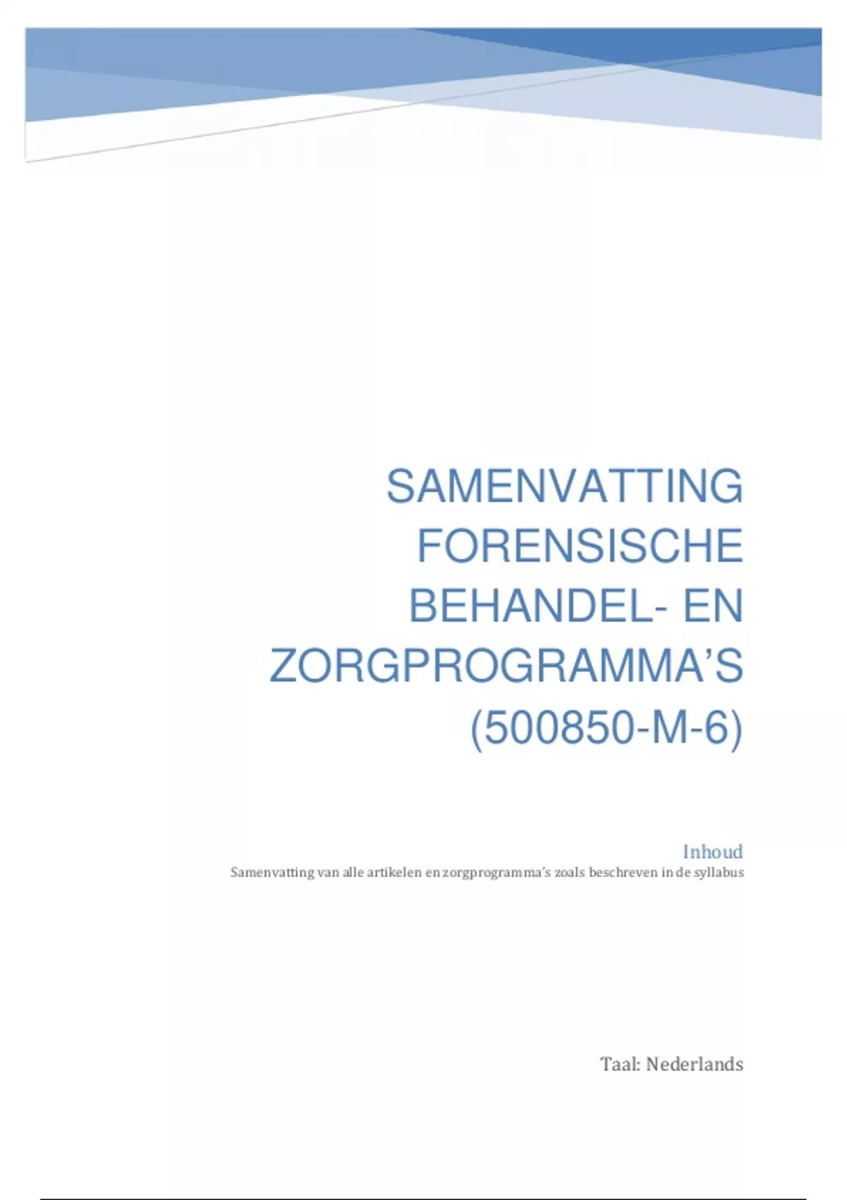 Samenvatting van alle artikelen en zorgprogramma’s zoals beschreven in de syllabus