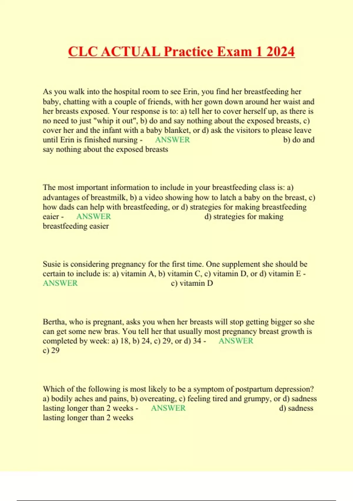 CLC ACTUAL Practice Exam 1 2024 As you walk into the hospital room to see Erin, you find her breastfeeding her baby, chatting with a couple of friends, with her gown down around her waist and her breasts exposed. Your response is to: a) tell her to cover herself up, as there is no need to just "whip it out", b) do and say nothing about the exposed breasts, c) cover her and the infant with a baby blanket, or d) ask the visitors to please leave until Erin is finished nursing - ANSWER b) do and say nothing about the exposed breasts The most important information to include in your breastfeeding class is: a) advantages of breastmilk, b) a video showing how to latch a baby on the breast, c) how dads can help with breastfeeding, or d) strategies for making breastfeeding eaier - ANSWER d) strategies for making breastfeeding easier Susie is considering pregnancy for the first time. One supplement she should be certain to include is: a) vitamin A, b) vitamin C, c) vitamin D, or d) vitamin E - ANSWER c) vitamin D Bertha, who is pregnant, asks you when her breasts will stop getting bigger so she can get some new bras. You tell her that usually most pregnancy breast growth is completed by week: a) 18, b) 24, c) 29, or d) 34 - ANSWER c) 29 Which of the following is most likely to be a symptom of postpartum depression? a) bodily aches and pains, b) overeating, c) feeling tired and grumpy, or d) sadness lasting longer than 2 weeks - ANSWER d) sadness lasting longer than 2 weeks Which infant is at risk for iron-deficiency anemia? a) infant weighing more than 3000 g at birth, b) breastfed infant whose mother lost 2 units of blood at delivery, c) infant who is exclusively breastfed for longer than 6 months, or d) infant who is fed cow's milk before a year of age - ANSWER d) infant who is fed cow's milk before a year of age Sixteen-year-old Trudy delivered her son at 29 weeks gestation. The NICU staff reports that she plans on formula-feeding. You decide to talk to her about breastfeeding. The most important reason you decide to do this is because: a) When women hear about the benefits of breast milk for their preterm infants, many will decide to at least pump while the baby is in the NICU, b) Trudy probably chose to formula-feed because it was unlikely she had any role models that had breastfed, c) the staff probably assumed she was going to formula-feed because Trudy is an adolescent, or d) the infant is still NPO and you have time to convince Trudy to changer her mind - ANSWER a) when women hear about the benefits of breast milk for their preterm infants, many will decide to at least pump while the baby i in the NICU The whey protein component of milk that can decrease milk supply is known as: a) suppressor peptides, b) fractional proteins, c) putrescine, or d) Feedback Inhibitor of Lactation (FIL) - ANSWER d) Feedback Inhibitor of Lactation (FIL)