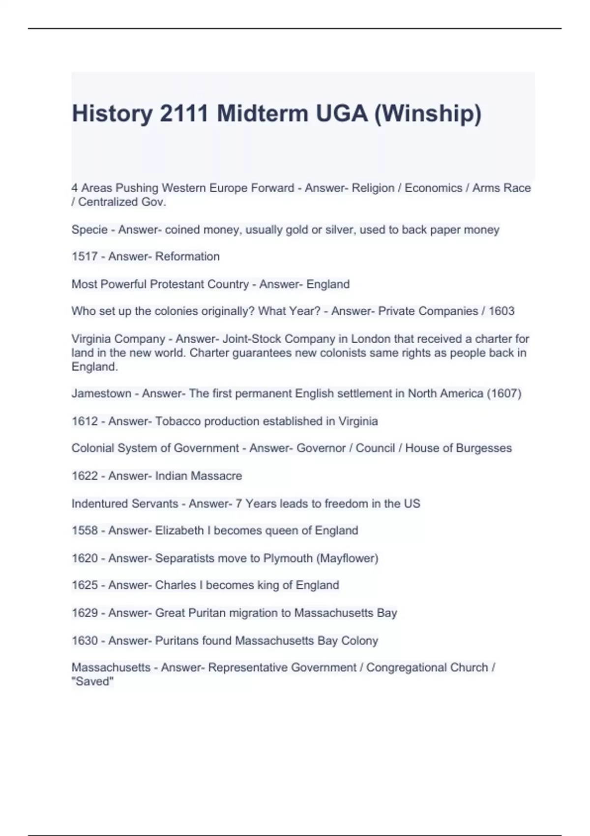 History 2111 Midterm UGA (Winship) Exam Questions and Answers 2024
