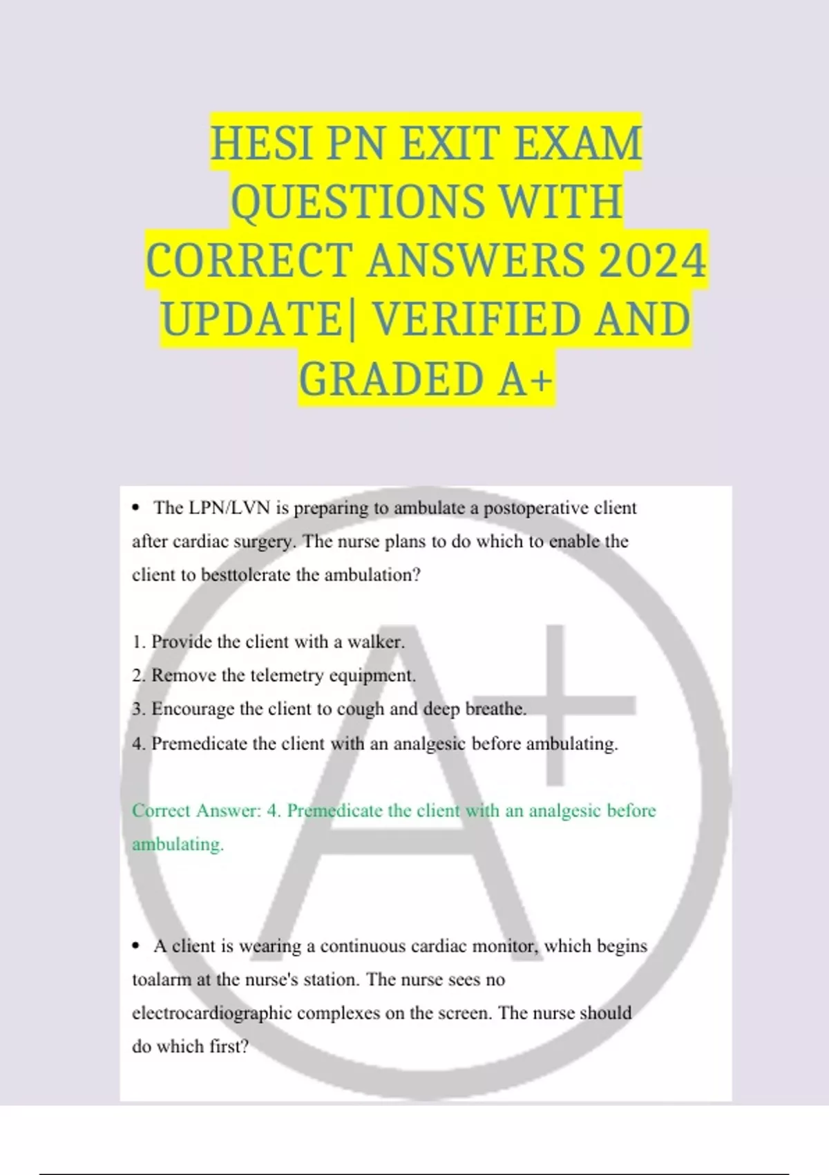 This document includes the updated 2025 HESI PN Exit Exam questions along with verified correct answers and detailed explanations. It covers all key nursing areas assessed in the HESI Practical Nursing Exit Exam, including pharmacology, patient care, safety, maternity, pediatrics, and mental health nursing. Perfect for students preparing for graduation or licensure exams, this complete set is aligned with the latest HESI testing standards and ensures comprehensive review and understanding. HESI PN EXIT EXAM QUESTIONS WITH CORRECT ANSWERS 2024 UPDATE| VERIFIED AND GRADED A+HESI PN EXIT EXAM QUESTIONS WITH CORRECT ANSWERS 2024 UPDATE| VERIFIED AND GRADED A+HESI PN EXIT EXAM QUESTIONS WITH CORRECT ANSWERS 2024 UPDATE| VERIFIED AND GRADED A+