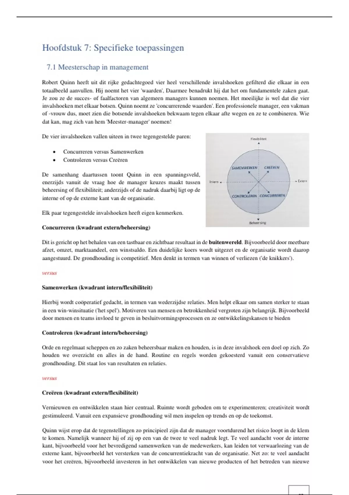 Het hoofdstuk "Specifieke toepassingen" behandelt de vier waarden van meesterschap in management, zoals voorgesteld door Robert Quinn. Deze waarden omvatten concurreren versus samenwerken en controleren versus creëren, die zich vertalen naar vier invalshoeken. Managers moeten deze tegenstellingen in balans brengen om effectief te zijn. Quinn benadrukt het belang van samenwerking, waarbij competentie- en motivatiemanagement essentieel zijn. Competentiemanagement omvat het identificeren en ontwikkelen van vaardigheden die nodig zijn voor verschillende taken, terwijl motivatiemanagement draait om het begrijpen van de behoeften van medewerkers en het bieden van passende stimulansen. Verschillende motivatietheorieën worden behandeld, waaronder die van Maslow, Herzberg en Vroom.