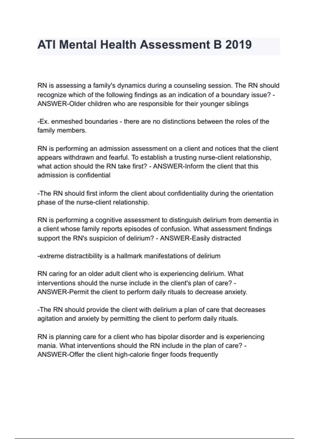 ATI Mental Health Assessment B 2019 RN is assessing a family's dynamics during a counseling session. The RN should recognize which of the following findings as an indication of a boundary issue? - ANSWER-Older children who are responsible for their younger siblings -Ex. enmeshed boundaries - there are no distinctions between the roles of the family members. RN is performing an admission assessment on a client and notices that the client appears withdrawn and fearful. To establish a trusting nurse-client relationship, what action should the RN take first? - ANSWER-Inform the client that this admission is confidential -The RN should first inform the client about confidentiality during the orientation phase of the nurse