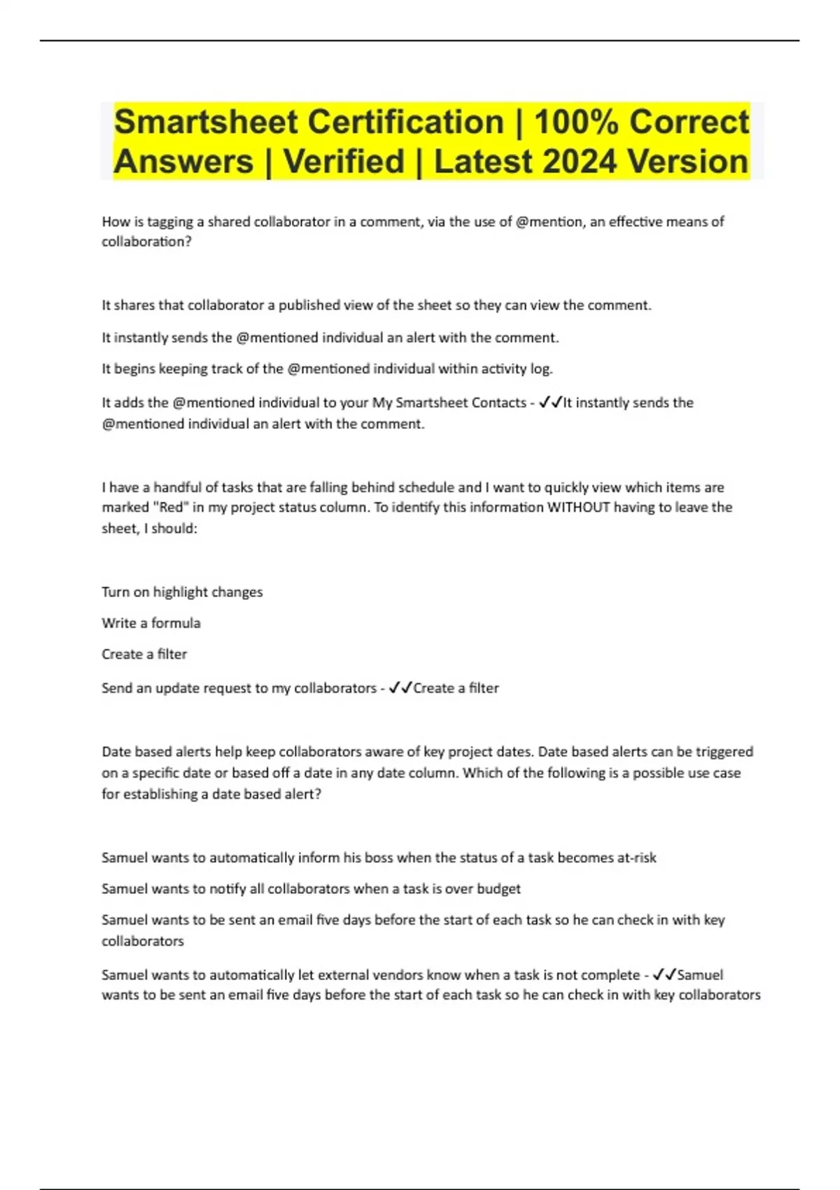 Smartsheet Certification | 100% Correct Answers | Verified | Latest 2024 Version