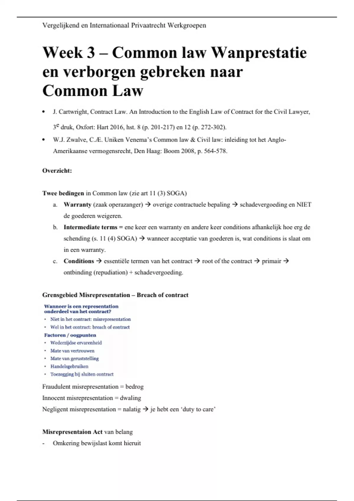 - Artikel Zwalve: uitleg van geborgen gebreken in common law (p.573 over Mispresentation Act)