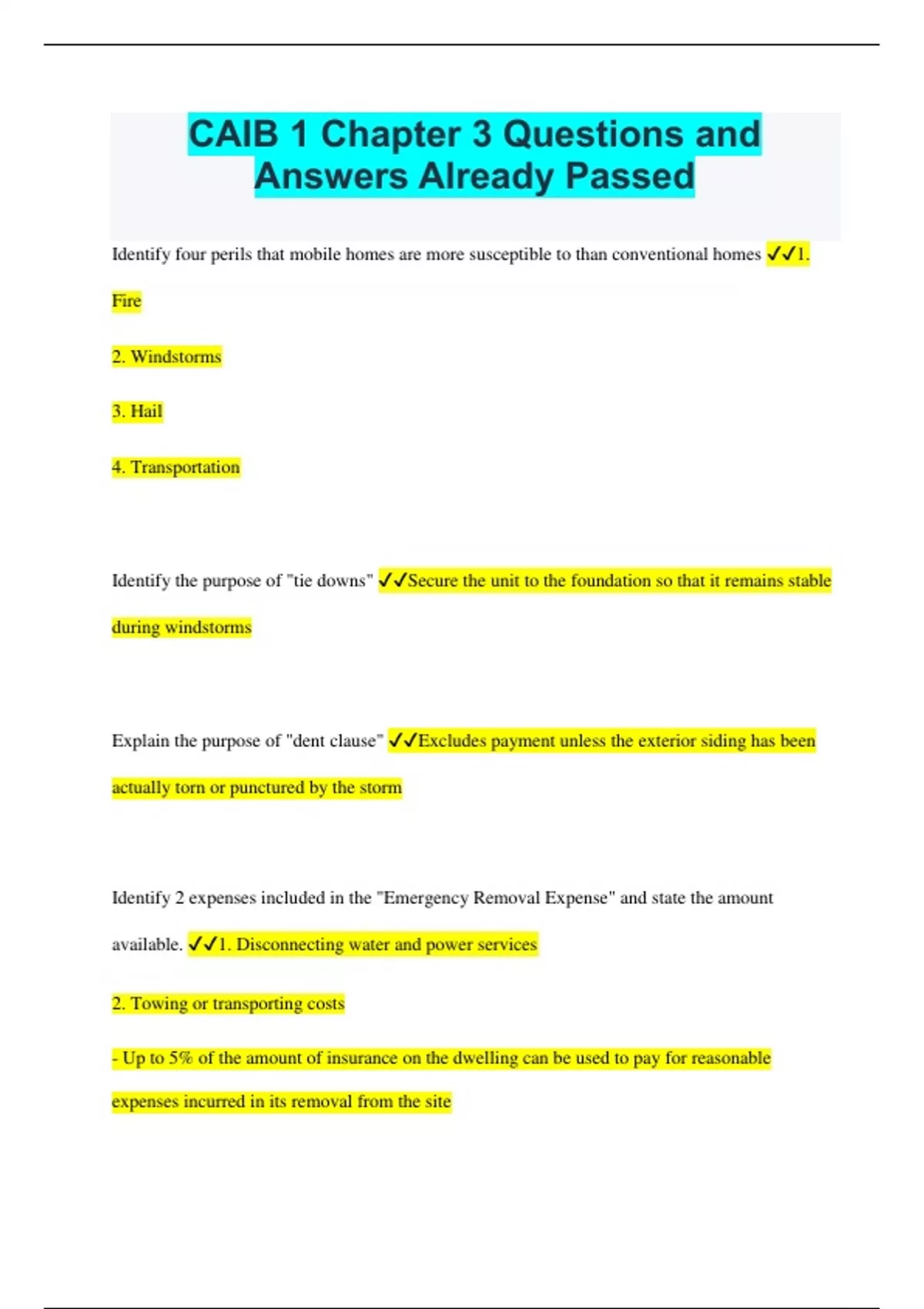 CAIB 1 Chapter 3 Questions and Answers Already Passed Identify four perils that mobile homes are more susceptible to than conventional homes 1. Fire 2. Windstorms 3. Hail 4. Transportation Identify the purpose of "tie downs" Secure the unit to the foundation so that it remains stable during windstorms Explain the purpose of "dent clause" Excludes payment unless the exterior siding has been actually torn or punctured by the storm Identify 2 expenses included in the "Emergency Removal Expense" and state the amount available. 1. Disconnecting water and power services 2. Towing or transporting costs - Up to 5% of the amount of insurance on the dwelling can be used to pay for reasonable expenses incurred in its removal from the site Identify two exclusions to the Mobile Home Insurance Form (IBC 1157) 1. Loss or damage caused by moving 2. Loss due to conversion, embezzlement or secretion by any person in possession of the building Identify 4 prospects for a Tenant's Package policy. 1. Those living in apartments 2. Those renting a dwelling or portion of it 3. Those who as a part of their remuneration, receive the use of a dwelling 4. Owner(s) of a business who occupies private living quarters in a mercantile or commercial building owned by the business Identify 2 items normally insured within the definition of personal property. 1. Appliances 2. Furniture Define "condominium" System of separate ownership of individual units in a multiple unit building Identify the 2 items that the Condominium Corporation is responsible to insure. 1. The value of the building 2. The value of common elements Identify 3 "common elements" 1. Parking area 2. Landscaping 3. Recreational areas In addition to the personal property, identify the 3 unique coverages available to unit owners. 1. Coverage U1 - Improvements and betterments 2. Coverage U2 - Loss Assessment 3. Coverage U3 - Unit Additional Protection