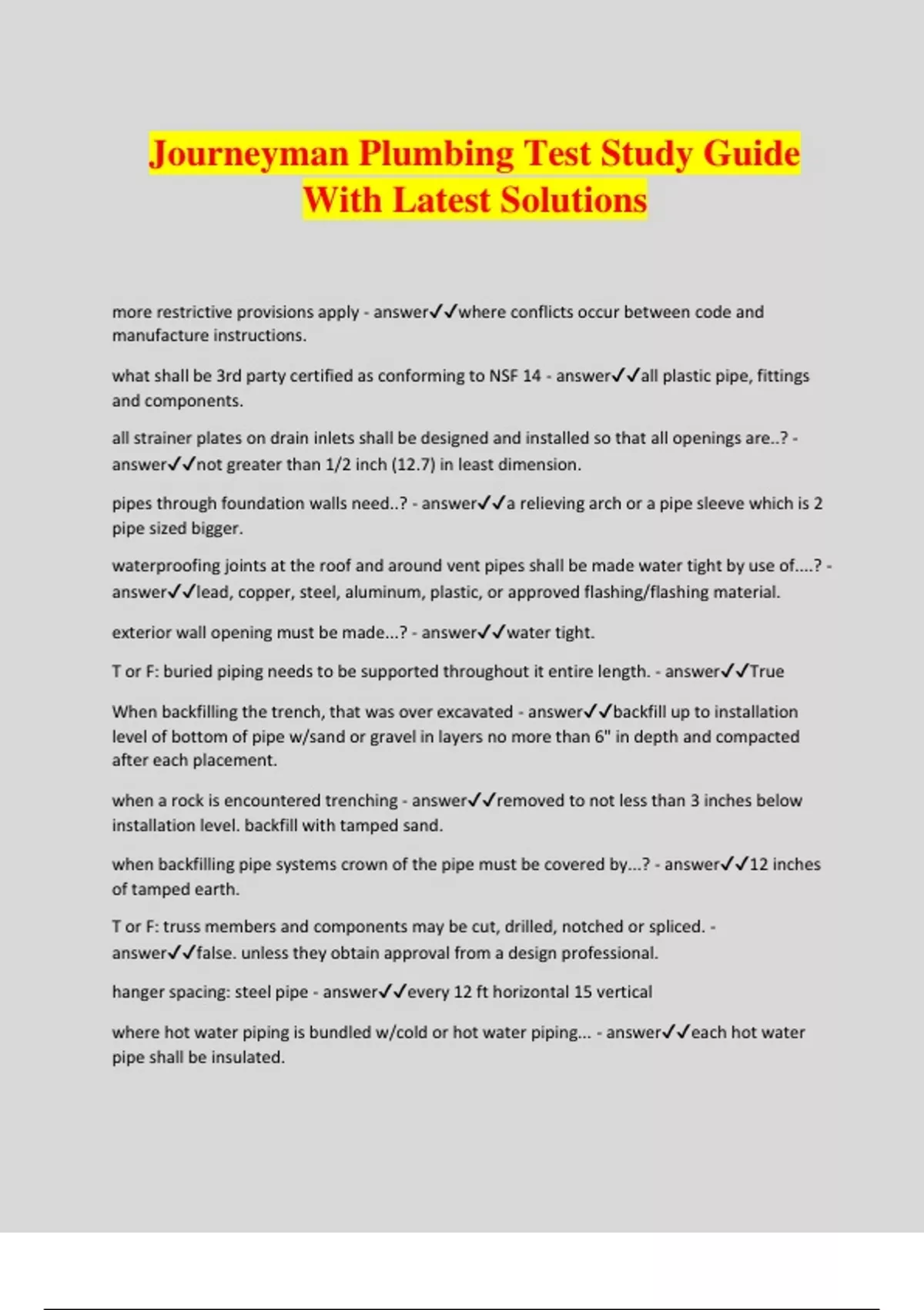 Journeyman Plumbing Test Study Guide With Latest Solutions more restrictive provisions apply - answerwhere conflicts occur between code and manufacture instructions. what shall be 3rd party certified as conforming to NSF 14 - answerall plastic pipe, fittings and components. all strainer plates on drain inlets shall be designed and installed so that all openings are..? - answernot greater than 1/2 inch (12.7) in least dimension. pipes through foundation walls need..? - answera relieving arch or a pipe sleeve which is 2 pipe sized bigger. waterproofing joints at the roof and around vent pipes shall be made water tight by use of....? - answerlead, copper, steel, aluminum, plastic, or approved flashing/flashing material. exterior wall opening must be made...? - answerwater tight. T or F: buried piping needs to be supported throughout it entire length. - answerTrue When backfilling the trench, that was over excavated - answerbackfill up to installation level of bottom of pipe w/sand or gravel in layers no more than 6" in depth and compacted after each placement. when a rock is encountered trenching - answerremoved to not less than 3 inches below installation level. backfill with tamped sand. when backfilling pipe systems crown of the pipe must be covered by...? - answer12 inches of tamped earth. T or F: truss members and components may be cut, drilled, notched or spliced. - answerfalse. unless they obtain approval from a design professional. hanger spacing: steel pipe - answerevery 12 ft horizontal 15 vertical where hot water piping is bundled w/cold or hot water piping... - answereach hot water pipe shall be insulated. pipe sizes great than 4 inch need restraints for drain pipes at.. - answerall changes in direction and changes in diameter greater that 2 pipe sizes. testing gauge required for 10 psi or less? - answerhas increments of .10psi or less. testing gauge required for 10 psi up to 100 psi - answerincrements of 1 psi testing gauge required for greater than 100 psi - answerincrements of 2 psi tests shall last not less than..? - answer15 minutes 2 ways you can test a drainage system. - answerin its entirety or in sections. if testing entire drainage system, all openings in piping shall be tightly closed except..? - answerthe highest opening, and system shall be filled to point of overflowing. if drainage system is tested in sections, no section shall be tested with less than..? - answera 10 foot head of water. T or F: plastic piping shall not be tested using air. - answertrue. when testing drainage system w/air, force air into system until there is... - answera uniform pressure of 5 psi or sufficient to balance a 10 inch colum of mercury. (no air test on plastic piping ) drainage and vent final test shall be... - answervisual (smoke) gravity sewer test consists of plugging building sewer at point of connection w/ public sewer, filling building sewer with water testing with not less than... - answer10 foot head of water. maintain for 15 minutes. shower liner test. fill with water not less than... - answer2 inches measured at threshold. hanger spacing: lead pipe - answercontinuous horizontal, 4 feet vertical liquid combustion byproducts of condensing appliances shall be collected and discharged to... - answeran approved plumbing fixture or disposal area in accordance with manufacturer's instructions. appliances containing evaporator or cooling coils must be provided with... - answercondensate drain systems. condensate disposal piping shall maintain a horizontal slope in the direction of discharge not less than - answer1/8 unit vertical in 12 units horizontal (1 percent slope) sheet copper for general applications shall not weigh less than... - answer12 oz per sq. ft. T or F: separate facilities shall be required for dwelling units and sleeping units. - answerfalse separate facilities are not required in structures or tenant spaces with a total occupant load including employees and customers of... - answer15 or fewer. separate facilities are not required in Mercantile occupancies in which the max occupant load is.. - answer100 or fewer in occupancies other than malls, the public/employee toilet facilities shall be located...? - answerno more than 1 story above or below and path of travel not more than 500 feet. where should public and employee toilet facilities be located in malls? - answernot more than 1 story above or below with path of travel no more than 300 feet. what type of facilities shall be in excess of required minimum? - answerpay facilities T or F: egress door for multiple occupant toilet room other than family or assisted use rooms should be lockable from the inside - answerFalse directional signage to required public toilet facilities. - answerposted in a lobby,corridor, aisle or similar space so the sign can be readily seen from main entrance. drinking fountains distance from individual tenant space that doesn't have a drinking fountain. - answerwithin 500 feet of the most remote location in tenant space, and not more than one story above or below. if in a mall within 300 feet. accessible plumbing fixtures shall be installed with ____, ____,____ and _____ in accordance with ICC A117.1 - answerclearances, heights, spacing and areangements water supply and drain pipes under accessible lavatories and sinks shall be ____? - answercovered or otherwise configured to protect against contact. the supply lines and fittings for every plumbing fixture shall be installed so as to prevent what? - answerbackflow water closets urinals, lavatories and bidets shall not be set closer than _____ from its center to any side wall, partition, vanity or other obstruction, or closer than _____ center to center between adjacent fixtures. - answer15 inches 30 inches water closets urinals, lavatories and bidets clearance in front. - answer21 inches water closet compartments size requirements. - answernot less than: 30" wide