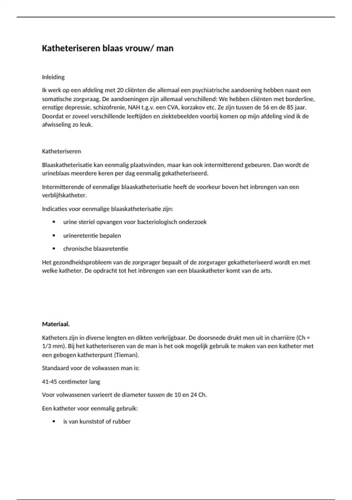 In dit verslag staat een samenvatting van de complicaties en aandachtspunten voor en na het katheteriseren van een man en vrouw. Onderaan het verslag staat een beknopte versie van het protocol.
