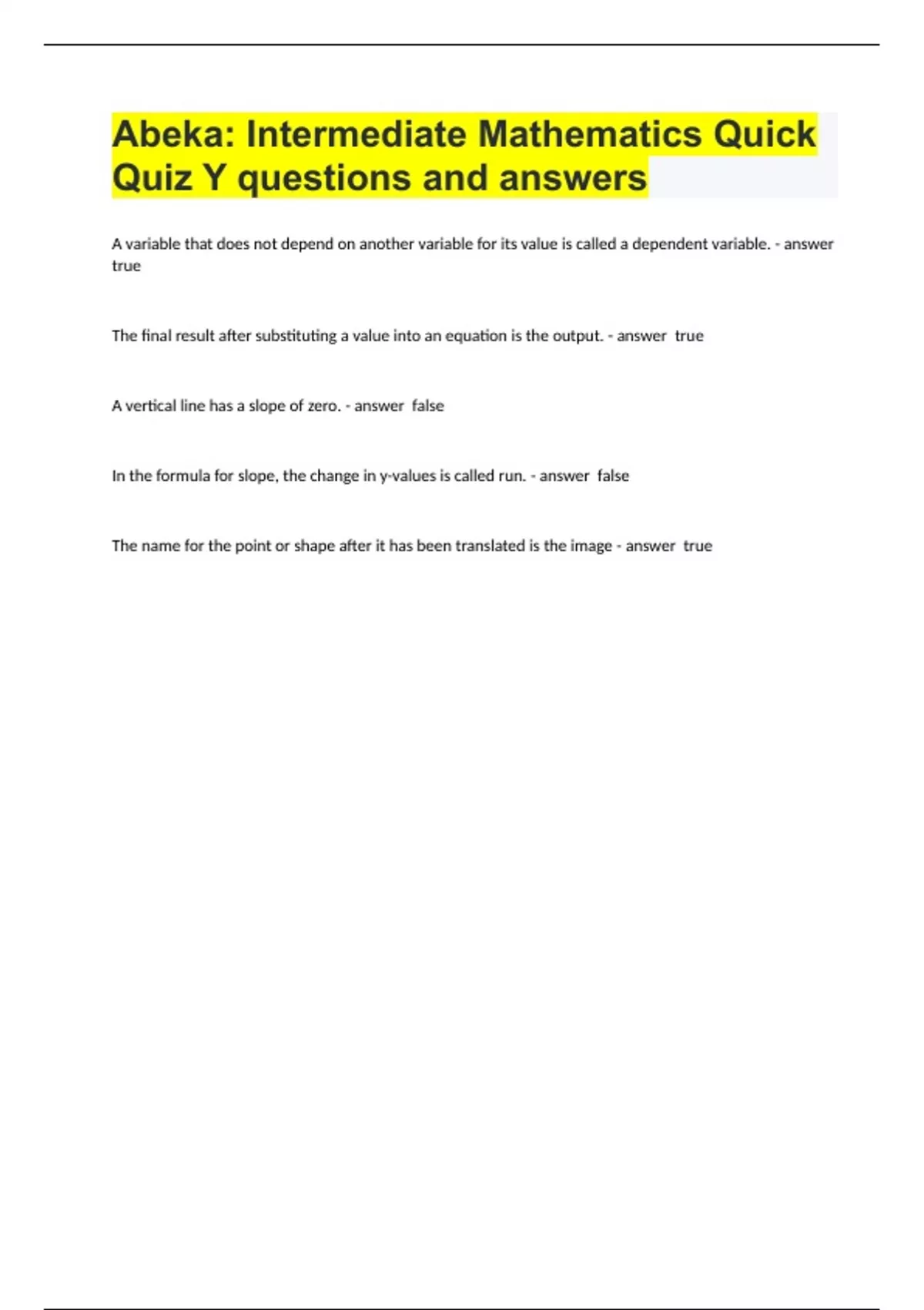Abeka Intermediate Mathematics Quick Quiz Y questions and answer.